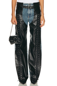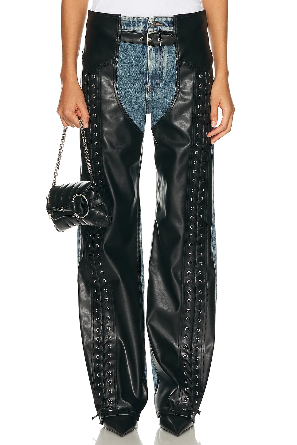 Details - Self 1 and 5: 100% cotton - Self 2: 100% polyester - Self 3: 100% acrylic - Self 4: 100% metal - Made in Italy - Dry clean - Zip-fly with button closure - Attached buckle closure at front - Dual pockets at back - Midweight denim textile with contrast faux leather panels - Stirrup inspired panels at front with lace-up details at front - Our Style No. SMCC-WJ43 - Manufacturer Style No. 6D04533SQH48