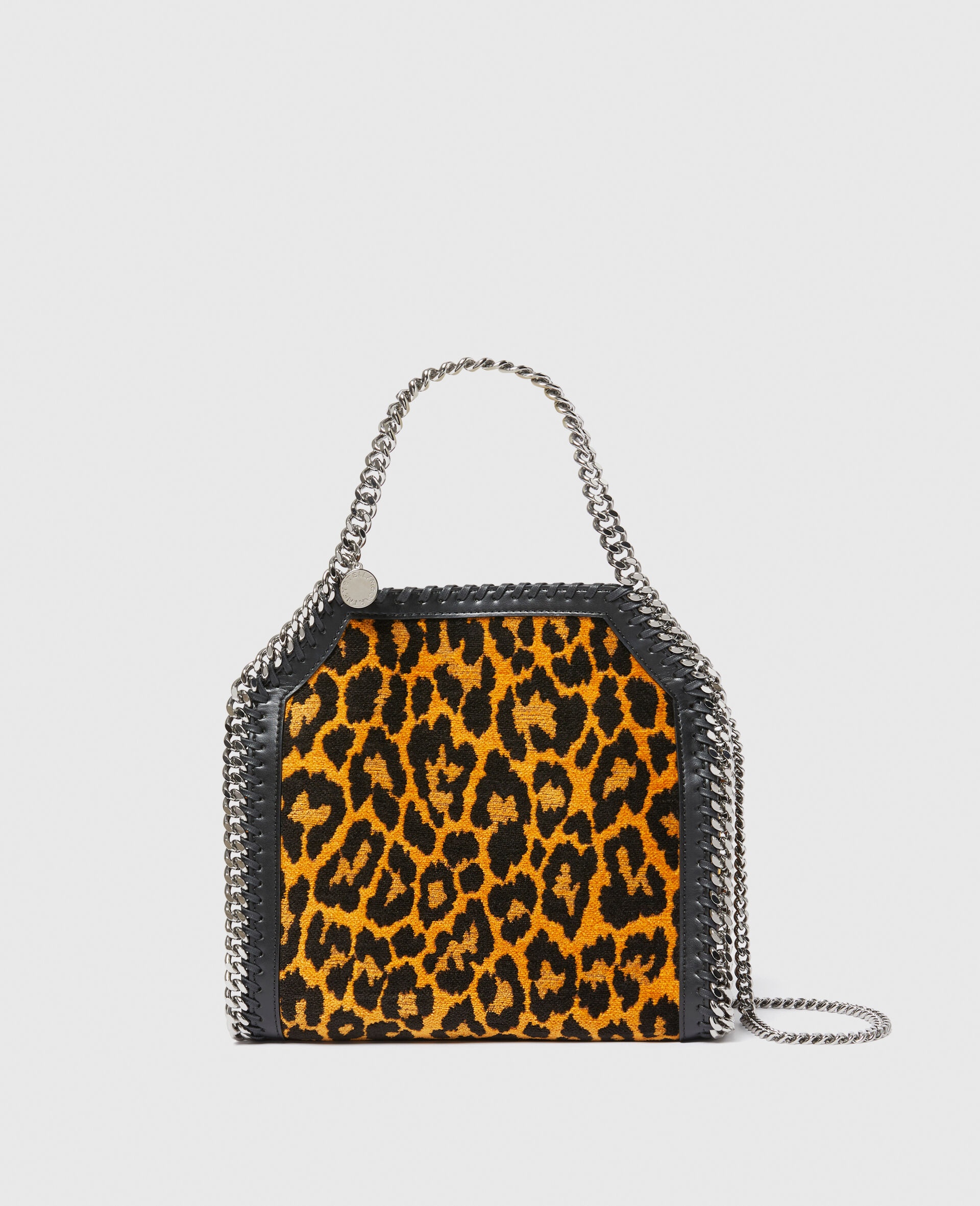 Item 371223WP04942018U Celebrating the beauty of animals without harming any, this iconic Falabella bag is consciously crafted from a vegan leopard-printed jacquard fabric made with organic cotton, GRS-certified recycled polyester and forest-friendly viscose. Characterized by its hand-laced, heavyweight diamond-cut chain outline and handles, its interior boasts enough room for your daily necessities with a slip pocket for smaller essentials. - Color: Leopard print - Comfortably fits all phones and wallets alongside small daily essentials - Leopard-print jacquard - Signature ruthenium recycled brass and recyclable aluminum diamond-cut chain - Waxed GOTS-certified organic cotton lacing - Two top handles, one shoulder strap - One main compartment - One internal slip pocket - Magnetic snap fastening - Engraved ruthenium logo medallion made from zero-waste zamak - Made in Italy - All of our shoes and accessories are made from non-leather materials in keeping with our cruelty-free ethos. Product Care & Fit Advice Care: Spot clean only with soft damp cloth. Composition: 60% Viscose, 20% polyester, 20% cotton - Fit: Comfortably fits all phones and wallets alongside small daily essentials. - Size: 10.4 x 9.2 x 3.9 in - Handle drop: 4.3 in - Strap length: 18.5 in - Weighs approximately: 0.87Kg