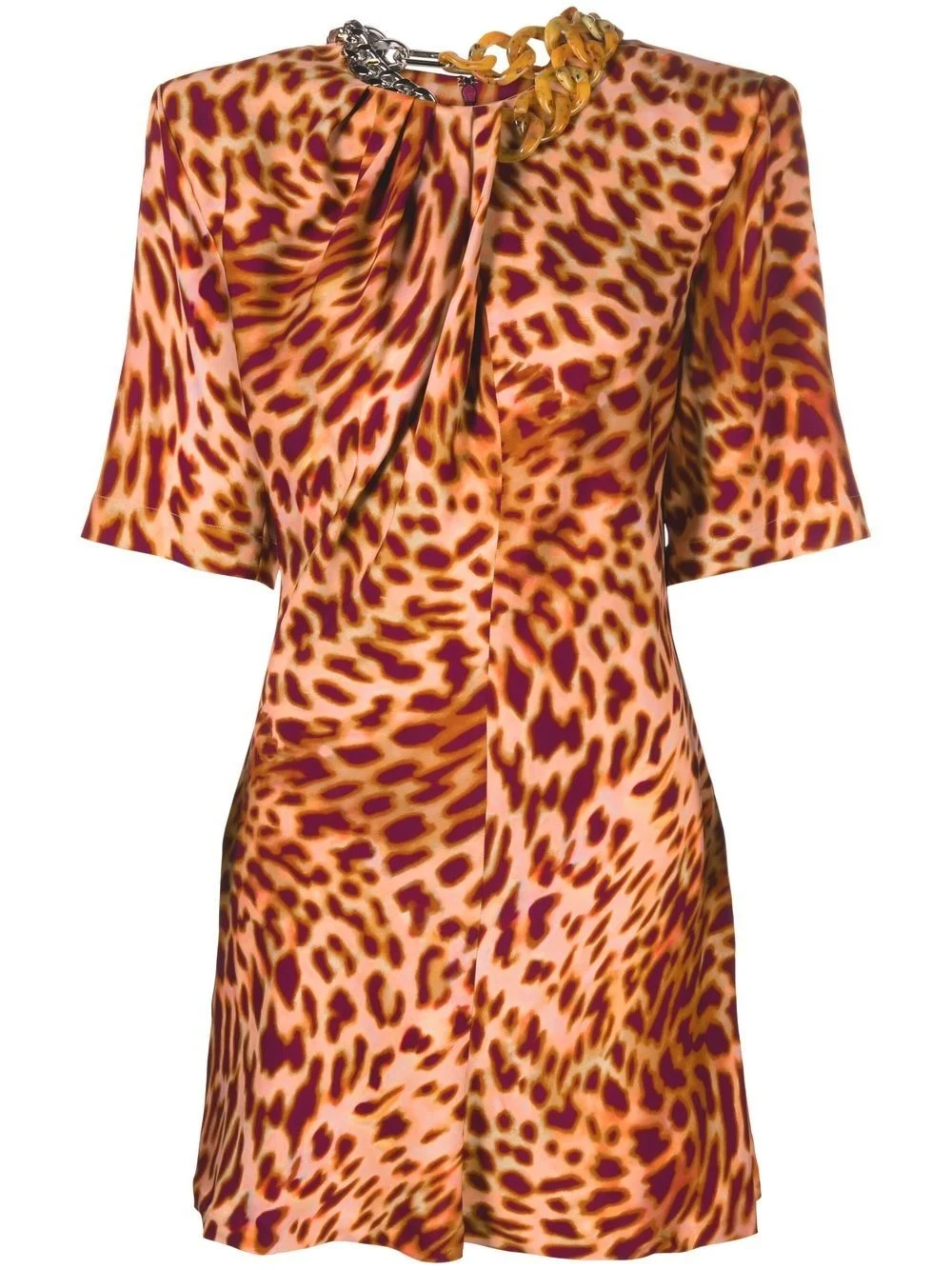 leopard-print mini dress This mini dress from Stella McCartney's AW22 collection exemplifies the brand's lighthearted and unpretentious approach to classic designs. This garment has an all-over leopard-print and features a feminine drape detailing at the neckline. Highlights - Martini pink - All-over leopard print - Draped detailing - Round neck - Short sleeves - Above-knee length - Straight hem Imported Composition Plastic 100%, Viscose 95%, Spandex/Elastane 5% SIZE & FIT Model measurements Height 5 ft 10 in(1.78 m) Bust/Chest 31.49 in(80 cm) Hips 35.03 in(89 cm) Waist 23.62 in(60 cm) Washing instructions Dry Clean Only