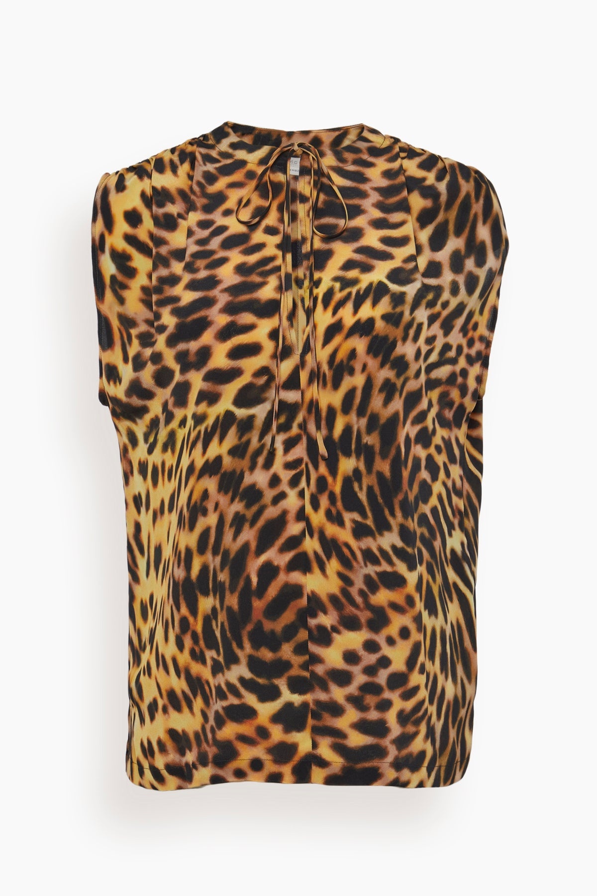 The Stella McCartney Sleeveless Top in Tortoise Shell is a bold piece from their PreFall 22 Collection. This blouse features a boxy silhouette with a tie front closure in a cheetah print. Wear yours with the matching skirt for a chic look. - Fits true to size, take your normal size - Sleeveless blouse - Boxy silhouette - Split neckline - Tie front closure - 100% Silk