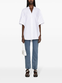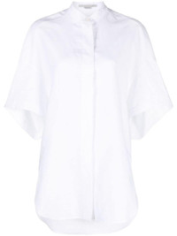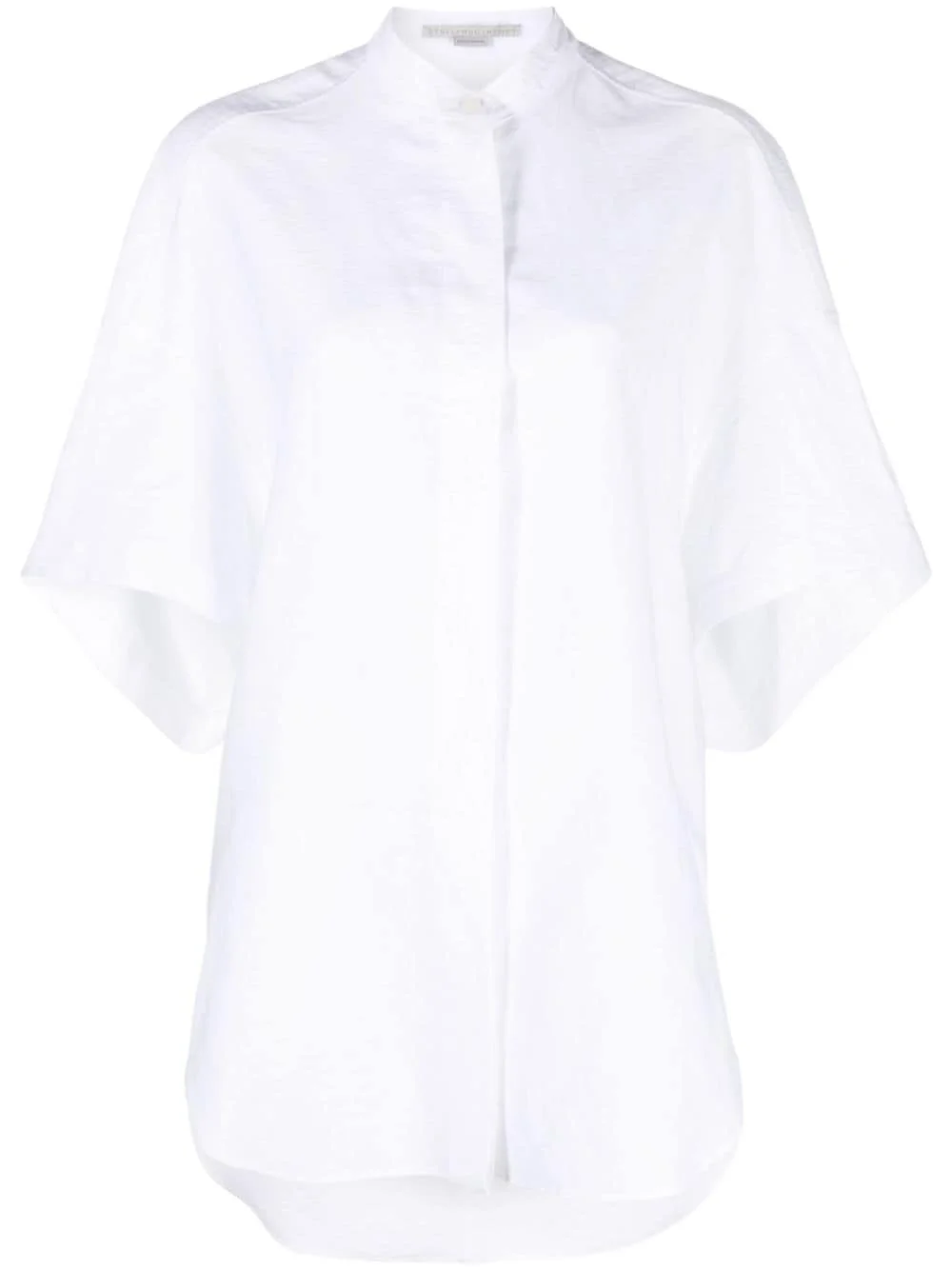 linen-blend tunic shirt Highlights - White - Linen-cotton blend - Band collar - Concealed front button fastening - Drop shoulder - Short sleeves - High-low hem Imported Composition Linen/Flax 49%, Cotton 40%, Polyamide 11% SIZE & FIT Model measurements Height 5 ft 11 in(1.8 m) Bust/Chest 34.25 in(87 cm) Hips 35.82 in(91 cm) Waist 24.8 in(63 cm) FittingInformation Designed to be unstructured, offering a loose fit throughout Made from a midweight non-stretch fabric This piece fits true to size – take your usual size Washing instructions Dry Clean Only