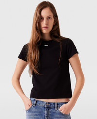 Item 6J01843SPZ741000 Build a foundational Stella wardrobe with this t-shirt. Responsibly crafted from organic cotton, using up to 70% less water to produce than conventional cotton, its classic crewneck silhouette is elevated with lettering charms spelling ‘Stella’ hand-stitched below the neckline. - Color: Black - Crewneck - Short sleeves - ‘Stella’ charm lettering - Ribbed trims - Waist-length hem - Made in Italy Product Care & Fit Advice Care: Dry clean only Composition: 100% Cotton Fit: Regular fit Sizing: Take your usual size Midweight, slightly stretchy fabric
