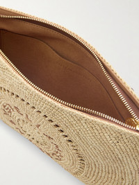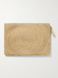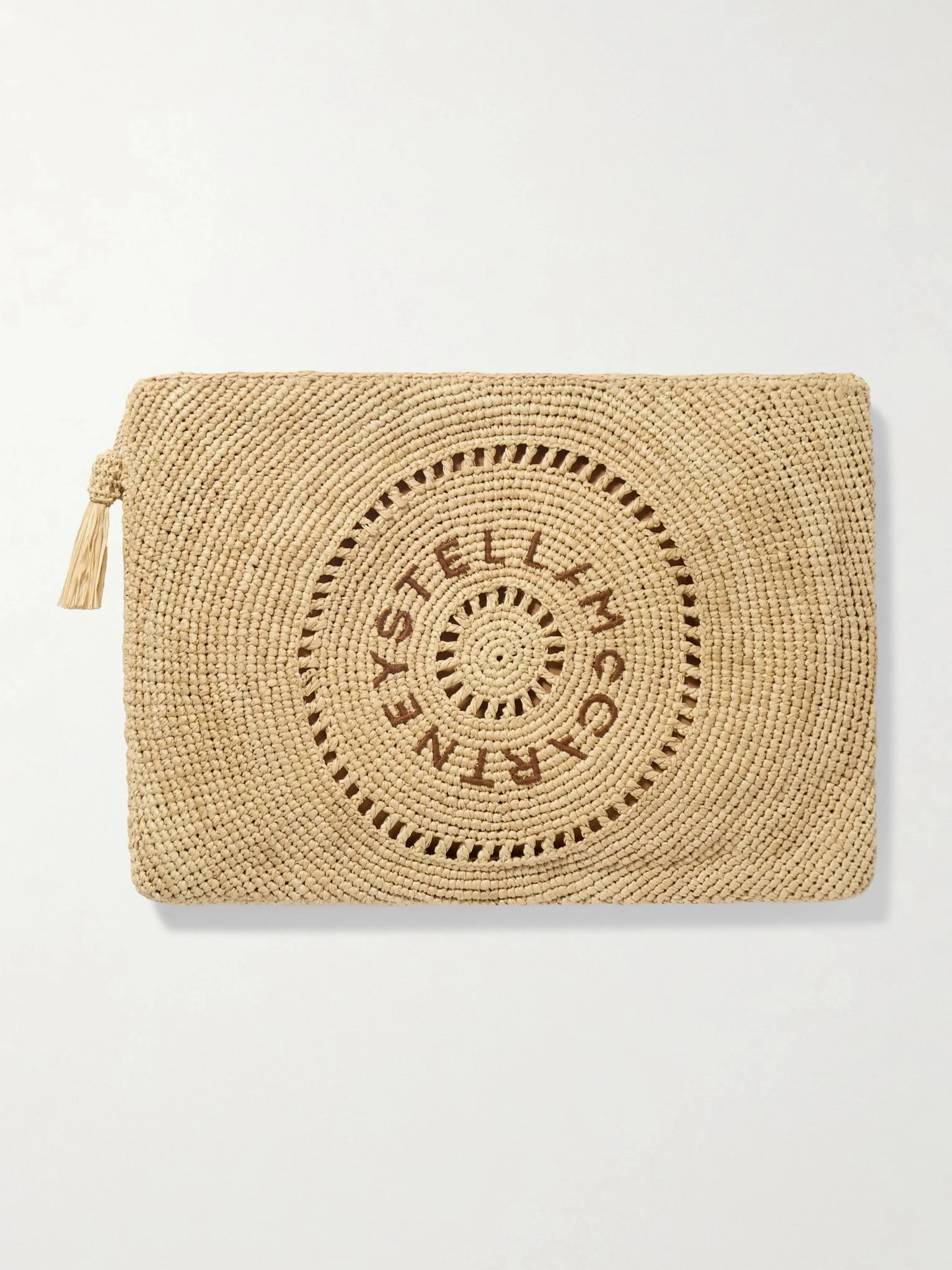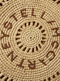Stella McCartney's clutch is woven from 100% natural raffia sourced from Madagascar. It's embroidered with a circular motif with ladder-like details and the logo. Unzip the tasseled pull tab to reveal a brushed interior with enough space for your cards and keys. Lower-Impact Materials. This product is made using at least 50% lower-impact materials or ingredients. Find out more about our NET SUSTAIN criteria here. Details & Care - Raffia - Brushed synthetic material lining - Zip fastening along top