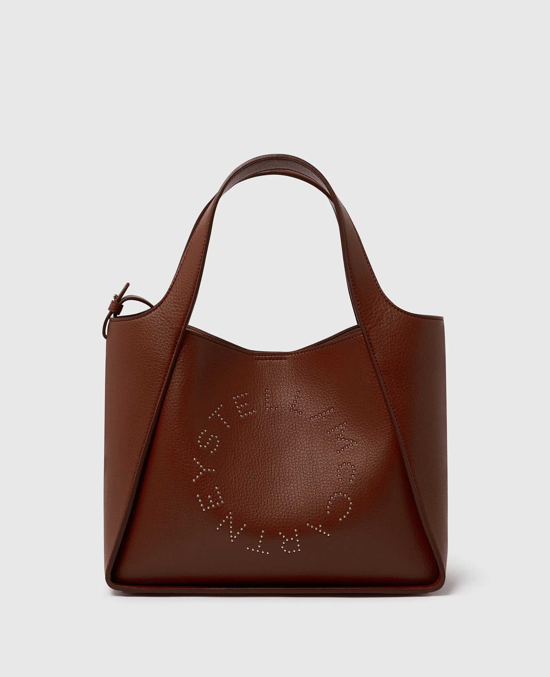 Item 513860WP05632215U The Stella Logo crossbody tote bag is a versatile year-round accessory, effortlessly worn crossbody, over the shoulder or held by its top handles. It is crafted from our luxury vegan alternative to animal leather, with a butter-soft hand-feel, and features our iconic circular Stella McCartney logo on the front. It is spacious enough for a tablet, phone and other daily essentials. - Color: Auburn - Comfortably fits all phones, tablets and wallets alongside small daily essentials - Smooth vegan alternative to animal leather sourced from recycled materials - Perforated Stella McCartney circular logo on front - Tonal single topstitching - Two top handles, and adjustable crossbody strap - One main compartment - Detachable pouch included - Magnetic snap fastening - Stainless steel and recycled brass hardware - Vegan alternative to suede lining - Handcrafted in Italy Product Care & Fit Advice - Care: Spot clean only with soft damp cloth. - Composition: 100% Polyamide - This is a coated fabric - Fit: Comfortably fits all tablets alongside daily essentials. - Size: 12.4 x 8.6 x 5.1 in - Handle drop: 5.1 in - Strap length: 18.5-20.4 in - Weighs approximately 18.5 oz