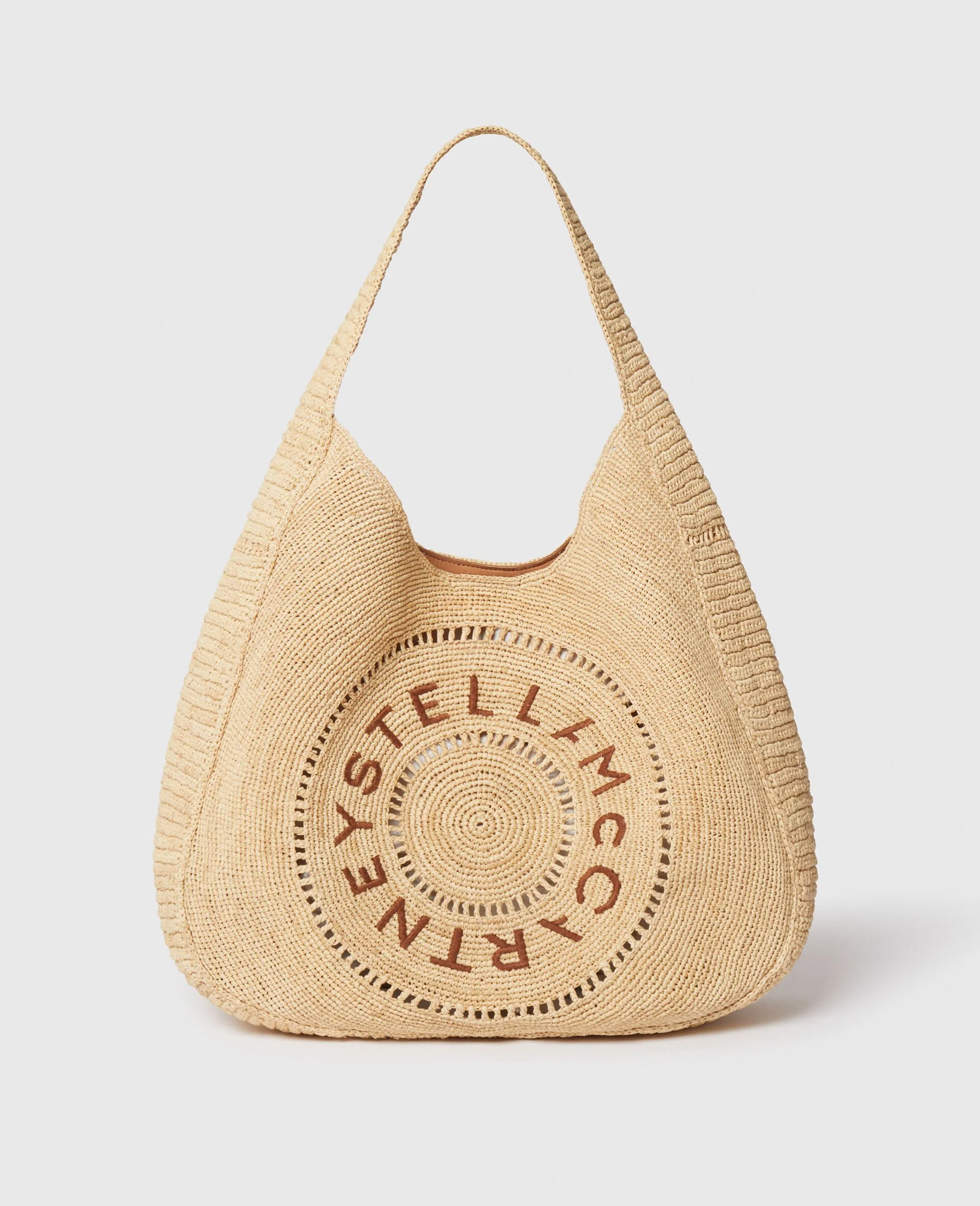 Item 7B0164WP03759370U Our slouchy Logo hobo tote bag is reimagined for High Summer in renewable raffia, handwoven in a fair-trade and safe workshop by female artisans in Madagascar – keeping traditional skills alive while protecting our planet for tomorrow. Raffia is an incredibly durable, easy-to-grow plant that supports soil health and absorbs greenhouse gasses. The luxury vegan bag is hand-finished with a Stella McCartney logo, embroidered on the front and lined with soft organic cotton. - Color: Natural beige - Comfortably fits 15” laptops, beach towel and daily essentials - Tanora raffia weave - Stella McCartney logo hand-embroidered on front - GOTS-certified organic cotton lining - One shoulder strap - One main compartment - Stainless steel and recycled brass hardware - Handcrafted in Madagascar Product Care & Fit Advice - Care: Spot clean only with soft damp cloth. - Composition: 100% Raffia - Fits all phones and wallets. - Size: 16.5 x 14.5 x 5.5 in - Handle drop: 11.4 in - All of our shoes and accessories are made from non-leather materials in keeping with our cruelty-free ethos.