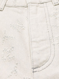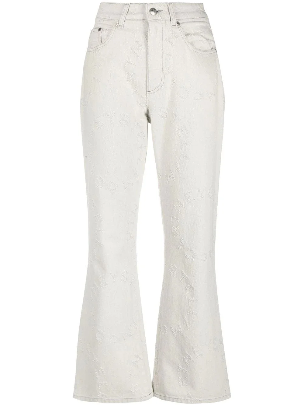 logo flared high-waisted trousers Designed in a pale shade of grey, these flared jeans from Stella McCartney's AW22 collection are adorned with a frayed logo pattern throughout for added texture whilst sitting white at the waist for an elongating silhouette. Highlights - Logo flared high-waisted trousers from stella mccartney featuring light grey, cotton blend, high-waisted, flared, front button and zip fastening, belt loops and classic five pockets. . Made in Italy Composition Outer: Cotton 100%, Polyurethane 100% Lining: Polyester 55%, Cotton 45% SIZE & FIT Model measurements Height 5 ft 10 in(1.77 m) Bust/Chest 31.49 in(80 cm) Hips 33.85 in(86 cm) Waist 22.44 in(57 cm) FittingInformation This piece fits true to size. We recommend you get your regular size Designed to be fitted at the waist and through the thigh, loose from the knee Made with a mid-weight non-stretch fabric Washing instructions Dry Clean Only