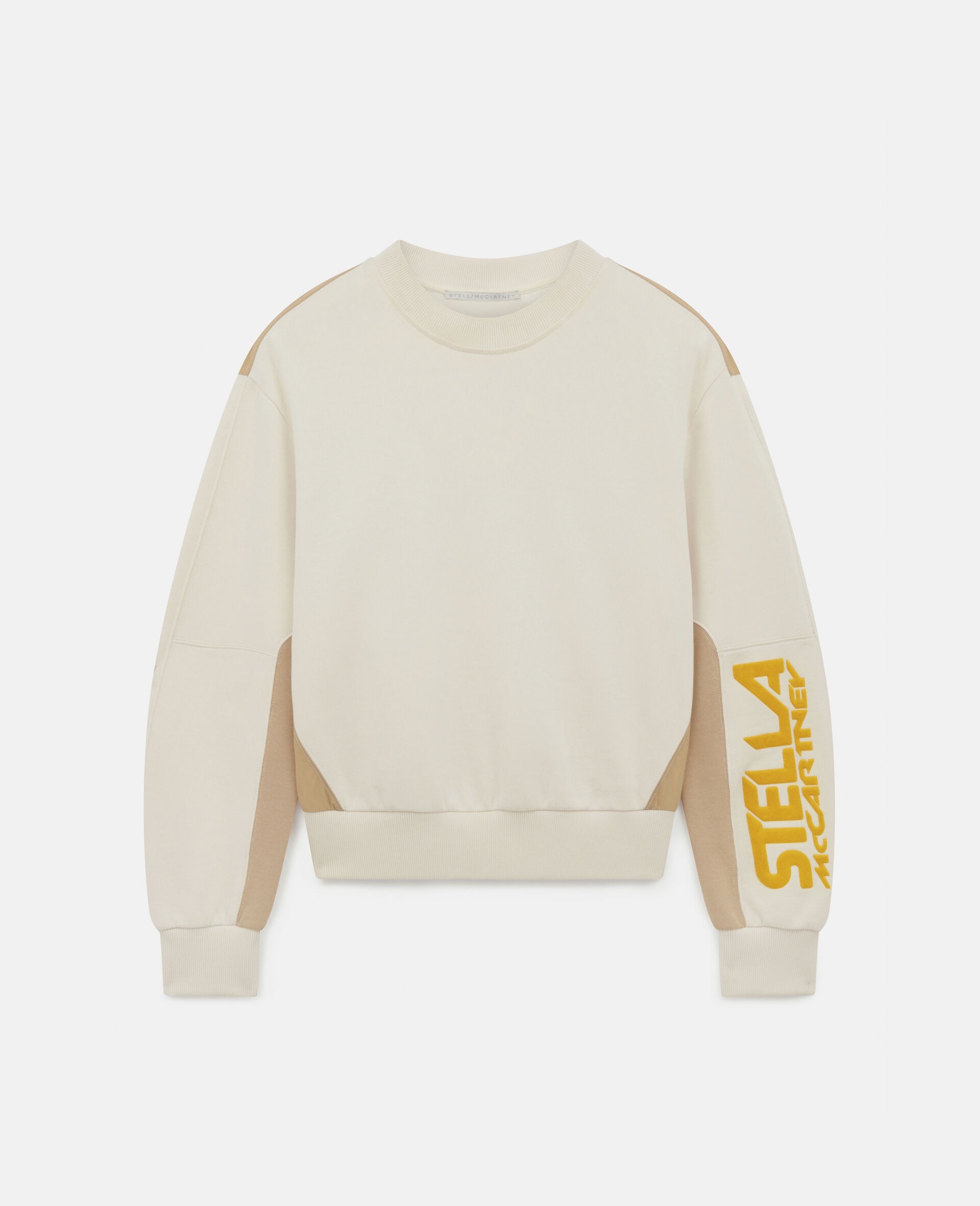 - Color: Cream - Tracksuit sweatshirt - Crew-neck, long sleeves - Stella McCartney logo print on the arm - Made in: Portugal - Care: Machine washable 30°C - Composition: 100% Organic Cotton - Fits true to size - Designed for a relaxed fit - Mid-weight, slightly stretchy fabric - Model is 5ft 10in/ 1.78m, is a size UK08 and wears a size IT40 (US04/ UK08/ FR36)