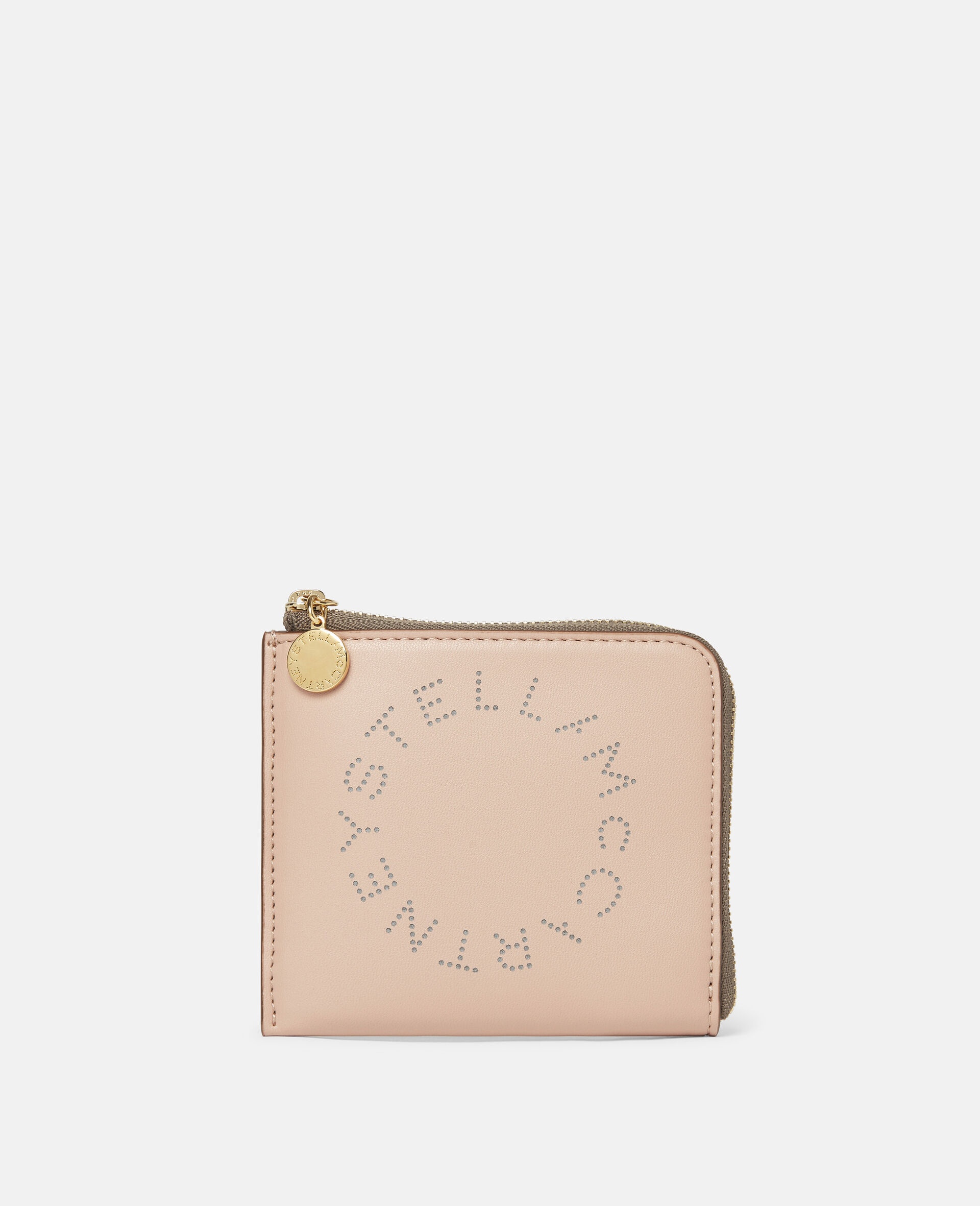 Item 700253W88566802U Our Logo cardholder is a functional essential with a zipped main compartment and removable classic cardholder. With room for up to eight credit cards, this wallet is decorated with a hand-painted Stella McCartney medallion logo at the front and contrast edges. - Colour: Powder - Blush pink - Smooth Alter Mat vegan alternative to animal leather - Hand-painted Stella McCartney dotted circular logo on front - Embossed Stella McCartney logo on interior - Contrast oat cream zip edge and interior - One main compartment - Eight card slots - Removable cardholder - Zip-around fastening - Engraved gold zamac logo medallion zip pull - Made in Italy Product Care & Fit Advice - Care: Use a soft damp cloth with a small amount of demineralised water (likewise for ironing) and apply to all the material. Leave the bag to dry. Avoid scrubbing to prevent damaging the surface of the bag. As this accessory is made from very delicate fabric, we recommend handling with care and avoiding contact with any sharp objects, jewellery, or rough surfaces. When not in use, always store the item in its protective bag. - Composition: Main fabric: 41% polyurethane, 33% biobased polyurethane, 26% post-consumer recycled polyester, Lining 100% polyamide - Size: 10.5 x 9.5 x 1cm - Weighs approximately 95g - All of our shoes and accessories are made from non-leather materials in keeping with our cruelty-free ethos.