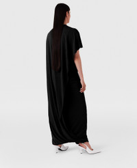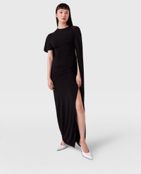 Item 6A04923FU3051000 Spun from lustrous forest-friendly viscose satin, this asymmetric dress is both directional and dramatic, shaped to a slinky, ankle-length silhouette with a single short sleeve contrasted with a cape wrapping around the other. - Color: Black - Crewneck - One short puff sleeve - One long cape sleeve - Ankle-length hem - Zipper fastening - Made in Italy Product Care & Fit Advice Care: Dry clean only Composition: 88% viscose, 12% elastane Fit: Regular fit Sizing: Take your usual size Midweight, non-stretch fabric