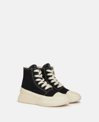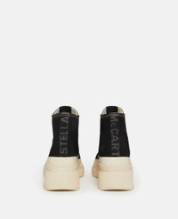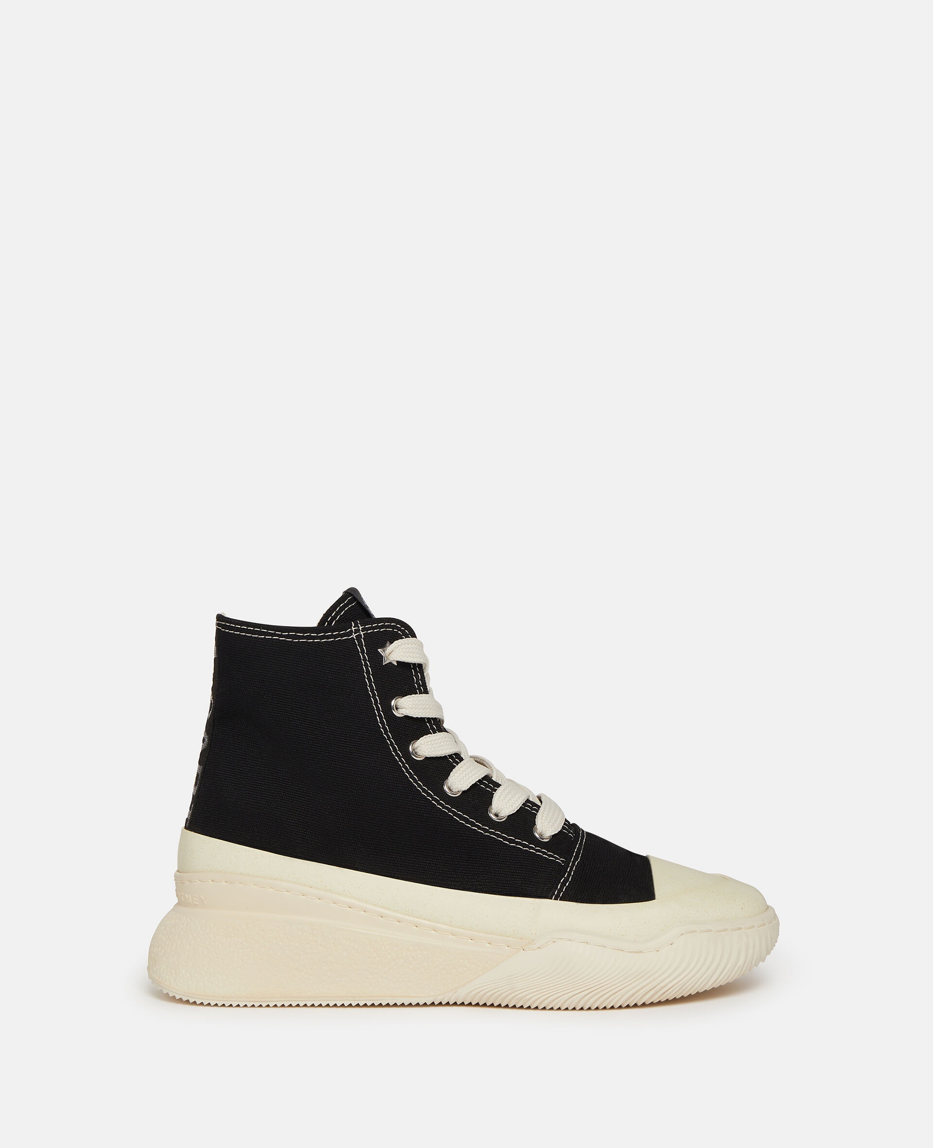 Item 810346E001661070 - Colour: Black/Cream - Midnight black - Pre-consumer recycled cotton-blend canvas upper - Stella McCartney logo tab on tongue and back heel - Stella star eyelets at top - Round toe - Lace-up fastening - Contrast cream chunky sole - High-top style - Fully lined - Made in Spain Product Care & Fit Advice - Care: Spot clean only with soft damp cloth - Composition: Upper: 50% pre-consumer recycled cotton, 50% organic cotton, Ribbon: 100% recycled polyester, Lining: 60% polyester, 24% pre-consumer recycled cotton, 14% post-consumer recycled polyester, 2% other fibres, Counter lining: 50% polyurethane, 50% recycled nylon, Eyelets: 100% nickel-free brass, Laces: 100% recycled polyester - 40mm sole - Fits true to size - All of our shoes and accessories are made from non-leather materials in keeping with our cruelty-free ethos.