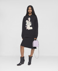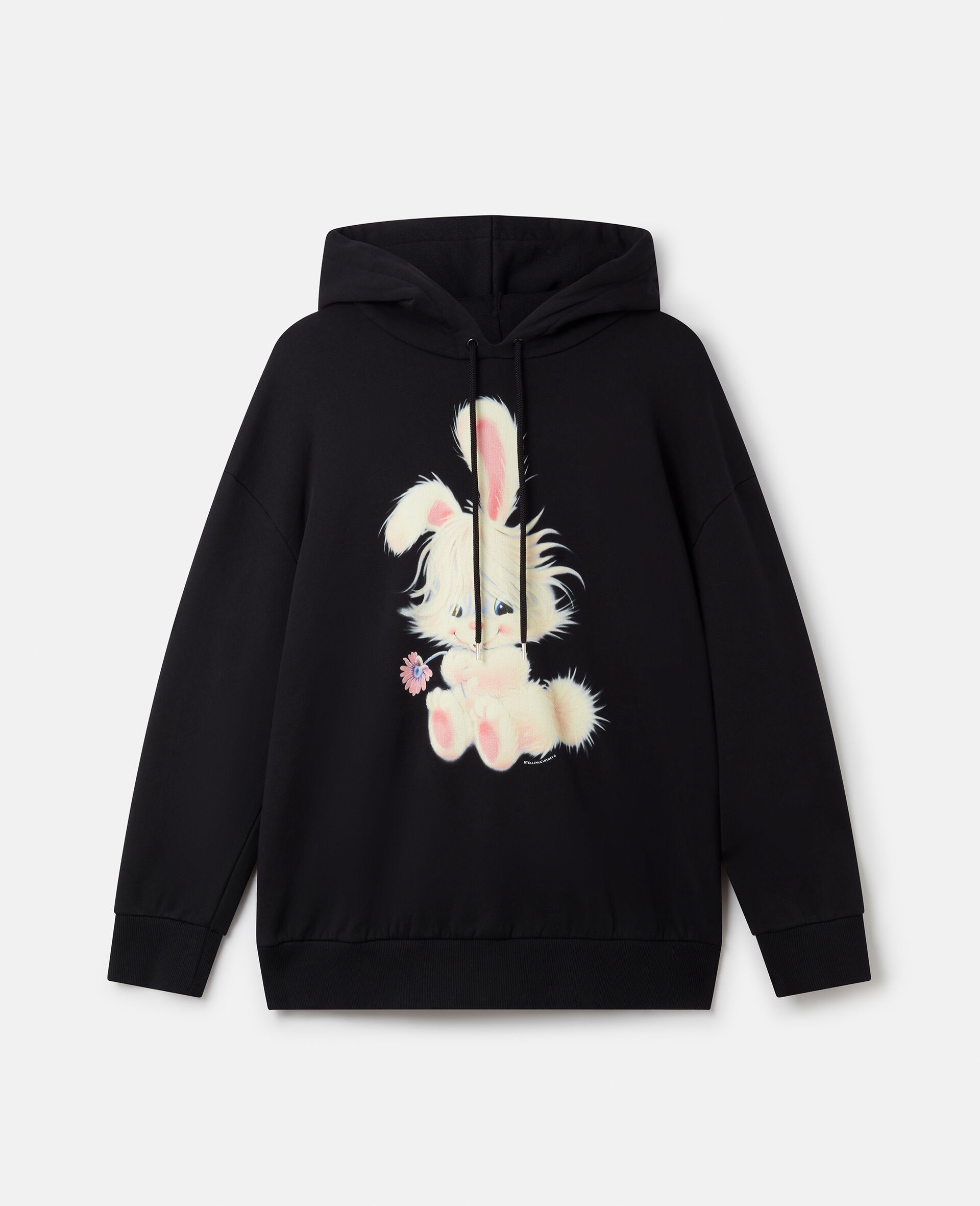 Celebrate Lunar New Year 2023 with this pure cotton black hoodie by Stella McCartney. Oversized for casual comfort, the hoodie has a 'Flora Not Angora' slogan across the back and a cartoon bunny on the front – playfully honouring the Year of the Rabbit and Stella's cruelty-free values. - Colour: Black - Lunar New Year 2023 unisex capsule collection - Midnight black - Cotton fleece - 'Flora Not Angora' slogan across back - Oversized playful cartoon rabbit motif on front - Drawstring hood - Long sleeves - Ribbed neckline, cuffs and hem - Made in Portugal Product Care & Fit Advice - Care: Machine washable at 30°C - Composition: Main fabric: 100% cotton, Rib: 98% cotton, 2% elastane