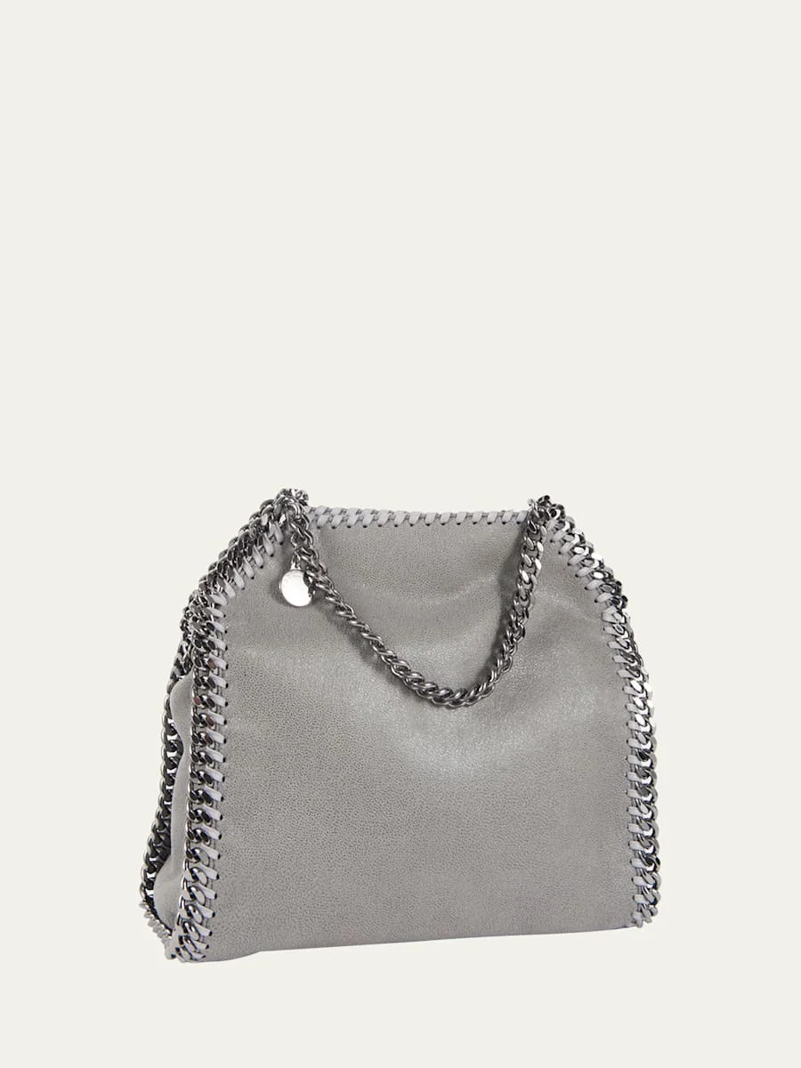 Stella McCartney shimmery faux-leather (polyester) crossbody bag. Signature whipstitching and gunmetal curb-chain trim. Top handles with logo disc; 4.5" drop. Chain shoulder/crossbody strap; 15" drop. Fold-over top with snap closure. Inside, logo fabric lining and open pocket. 10"H x 10"W x 4"D; weighs approx. 1lb. Made in Italy. Online Inquiries: BGS21_V3EVQ| Store Inquiries: #1975408