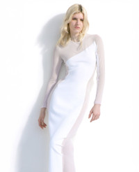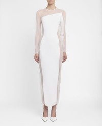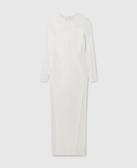Item 6K09553S25579000 The Stella McCartney Miracle Dress is an instantly recognizable, illusory icon from our archive. We bring this timeless outline into the now as a sculpting, forest-friendly viscose knit dress sensually accentuating the silhouette with revealing mesh panels. A fresh take on a forever icon. - Color: White - Crewneck - Long sleeve - Stretch-knit - Sheer mesh paneling - Ankle-length hem - Zipper fastening - Made in Italy Product Care & Fit Advice Care: Dry clean only Composition: 83% viscose, 17% polyester Fit: Sculpting, body-hugging fit Sizing: Take your usual size Midweight, stretchy fabric