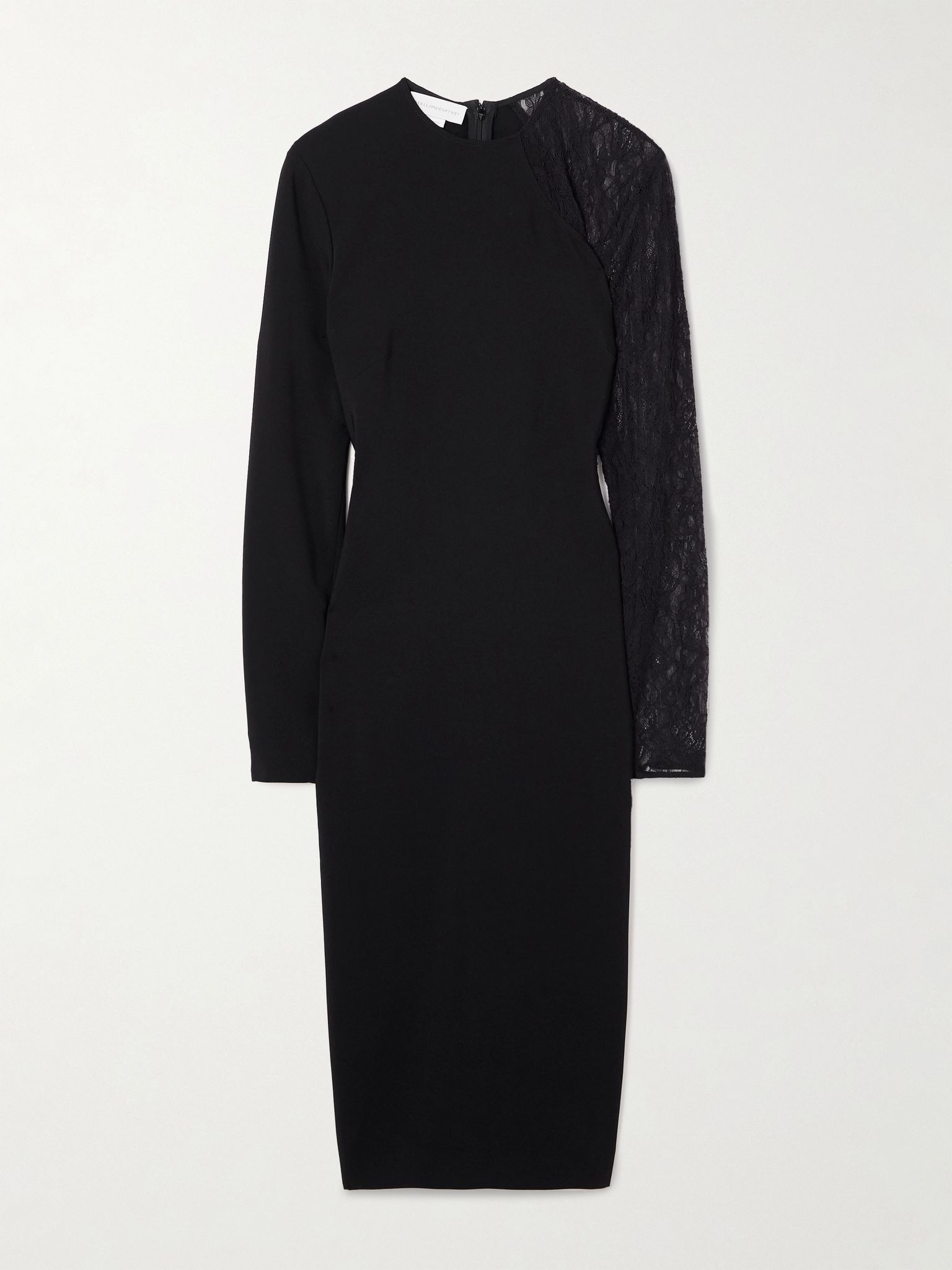Stella McCartney’s now-iconic dress first appeared on the runway in 2011 as the ‘Octavia,’ but it didn’t take long for the press to rename it the ‘Miracle Dress’ — a nod to its clever, contouring design that sculpts the body. This updated re-edition features similar contouring panels in crepe and romantic lace. The back split ensures you can move with ease. Size & Fit - Fits true to size, take your normal size - Designed for a slim fit - Mid-weight, slightly stretchy fabric - Model is 177cm/ 5'10" and is wearing an IT 40 Model measurements: - Bust: 86cm/ 34" - Waist: 65cm/ 25.5" - Hip: 90cm/ 35.5" Details & Care - Black crepe and lace - Concealed hook and zip fastening at back - 96% viscose, 4% elastane; trim: 85% polyamide, 15% elastane - Dry clean