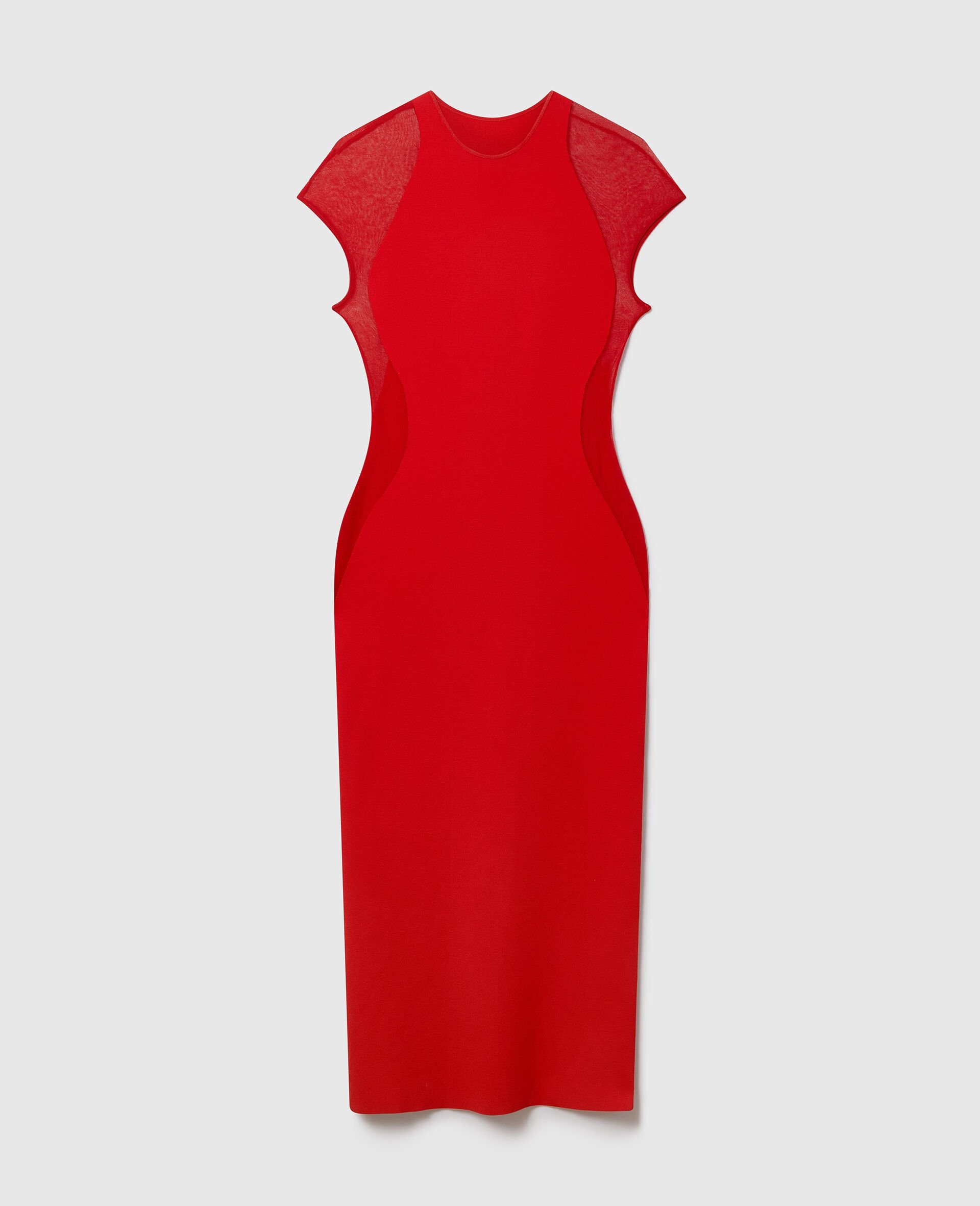 Item 6K09623S25576527 The Stella McCartney Miracle Dress is an instantly recognizable, illusory icon from our archive. We bring this timeless outline into the now as a sculpting, forest-friendly viscose knit dress sensually accentuating the silhouette with revealing mesh panels. A fresh take on a forever icon. - Color: Lipstick red - Crewneck - Short sleeve - Stretch-knit - Sheer mesh paneling - Calf-length hem - Zipper fastening - Made in Italy Product Care & Fit Advice Care: Dry clean only Composition: 83% viscose, 17% polyester Fit: Sculpting, body-hugging fit Sizing: Take your usual size Midweight, stretchy fabric