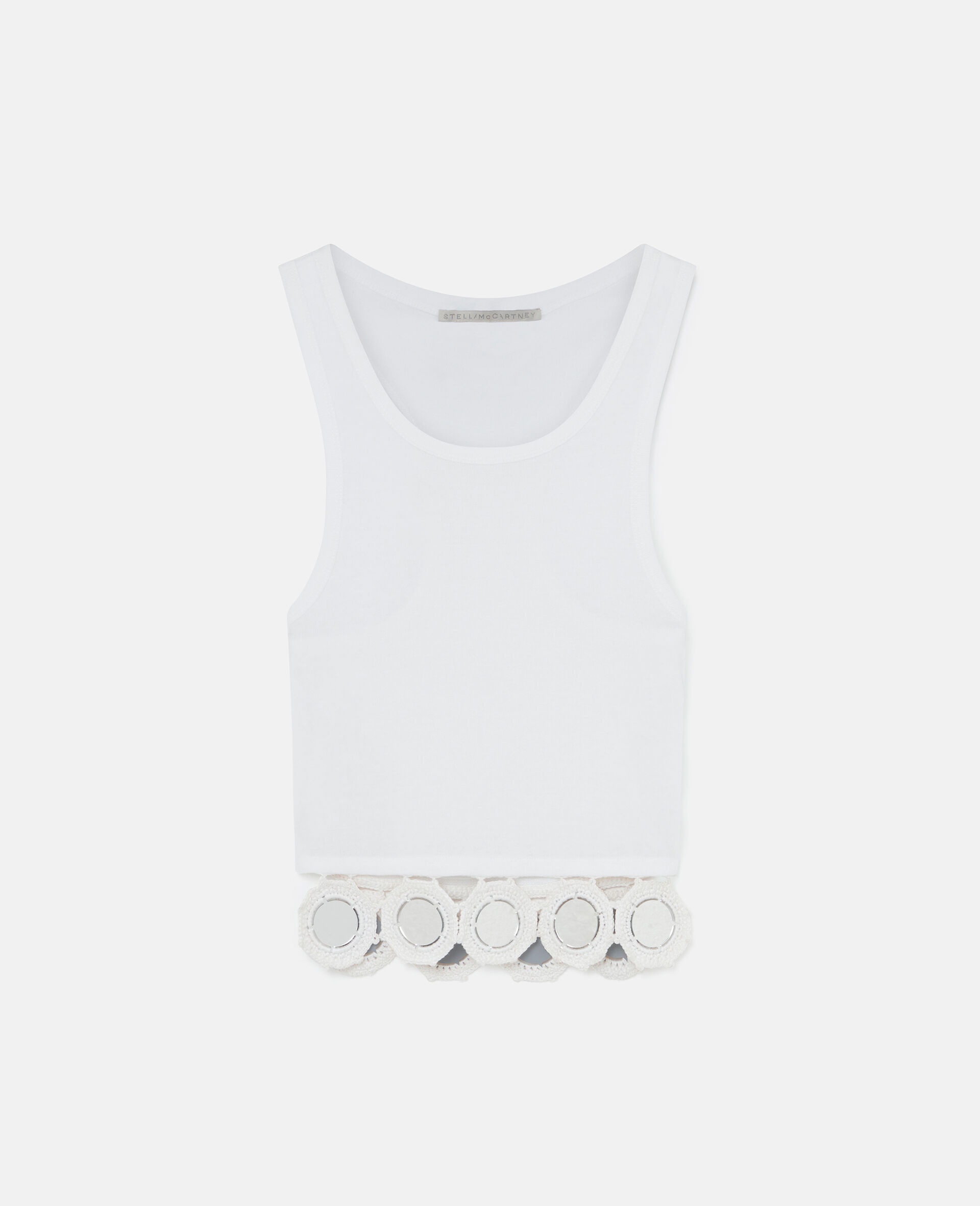 Item 6J03133SPZ329000 Crafted from a stretchy organic cotton blend – grown using no chemicals and 70% less water than conventional cotton – this tank is cut to a ribbed, racerback silhouette topped with piped trims. Look to the hem for crocheted, mirror-embellished trims and slip it on with the coordinating jeans. - Colour: White - Pure white - Ribbed texture - Scoop neck - Sleeveless - Piped trims - Crochet mirror trimmed hem - Slips on - Made in Portugal Product Care & Fit Advice Care: Dry clean only Composition: Main fabric: 67% lyocell 33% cotton Size: Fits true to size Designed for a regular fit Lightweight, stretch fabric
