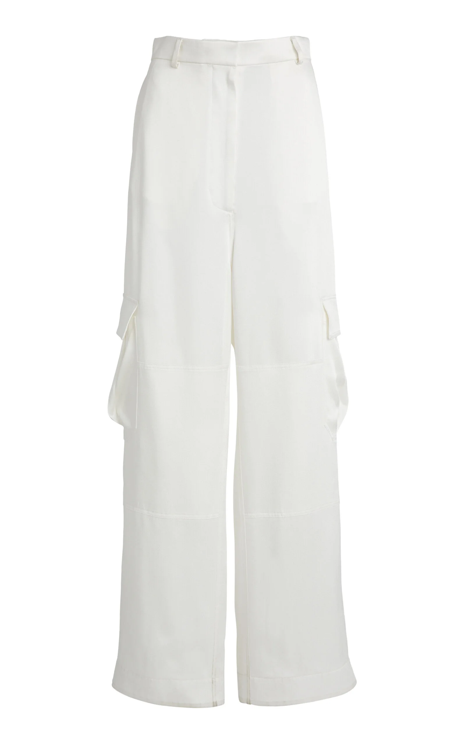 This season is a celebration of the Stella McCartney DNA. What is familiar becomes fresh again, as classic brand icons are made contemporary with wearability, desirability and, of course, sustainability. The trouser is a mixed poplin satin in cream hue features a mid rise and wide legged silhouette, and has an attached belt hoops with slash pockets on both sides. PRODUCT DETAILS - Pre-Fall '25 - Concealed zip fastening - Composition: 73% Acetate; 27% Viscose - Designer color: Cream - Dry clean only - Imported