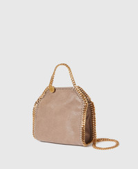 Item 391698W93552800U Elevate everyday dressing with this iconic Stella McCartney Falabella Tiny tote bag. Responsibly made from our signature grained Shaggy Deer fabric, this vegan tote bag is framed by a recycled brass and recyclable aluminum diamond-cut chain and is lined with recycled materials. There’s a slip pocket inside for smaller items, while the main compartment is roomy enough for keys, a phone and lipstick. - Color: Moss - Comfortably fits all phones alongside small daily essentials - Matte Shaggy Deer vegan alternative to animal leather with semi-gloss grain - Signature recycled brass and recyclable aluminum diamond-cut chain - Waxed GOTS-certified organic cotton lacing - Two top handles, one shoulder strap - One main compartment - One internal slip pocket - Magnetic snap fastening - Engraved logo medallion charm - Recycled polyester monogram lining - Handcrafted in Italy - All of our shoes and accessories are made from non-leather materials in keeping with our cruelty-free ethos. Product Care & Fit Advice - Care: Spot clean only with soft damp cloth. - Composition: 100% Polyester - Fit: Comfortably fits small daily essentials. - Size: 7 x 6.8 x 2.3 in - Handle drop: 2.7 in - Strap length: 18.5 in - Weighs approximately: 14.2 oz