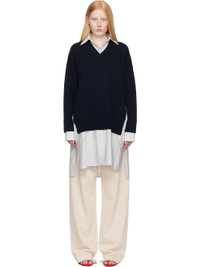 Knit RWS-certified virgin wool midi dress. Striped silk- and organic cotton-blend oxford cloth panels throughout. · Layered construction · Spread collar · Rib-knit trim at V-neck, hem, and cuffs · Three-button placket · Vented side seams · Dropped shoulders · Buttoned barrel cuffs · Logo-engraved hardware Made from cruelty-free, non-animal materials. Supplier color: Navy Body 1: 100% virgin wool. Body 2: 54% silk, 46% organic cotton. Trim: 100% virgin wool. Made in Romania 252471F054000
