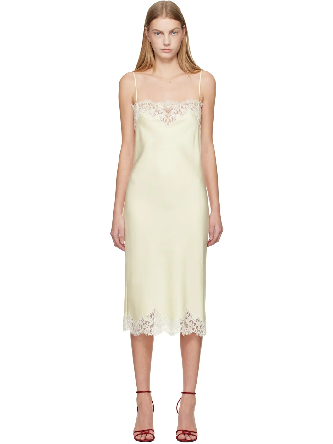 FSC-certified viscose-blend satin midi dress. Lace trim with scalloped edge at square neck and hem. · Concealed zip closure at side seam · Adjustable spaghetti straps · Unlined Made from cruelty-free, non-animal materials. Supplier color: Buttermilk Body: 73% acetate, 27% viscose. Trim: 69% cotton, 31% polyamide. Made in Italy 261471F054002
