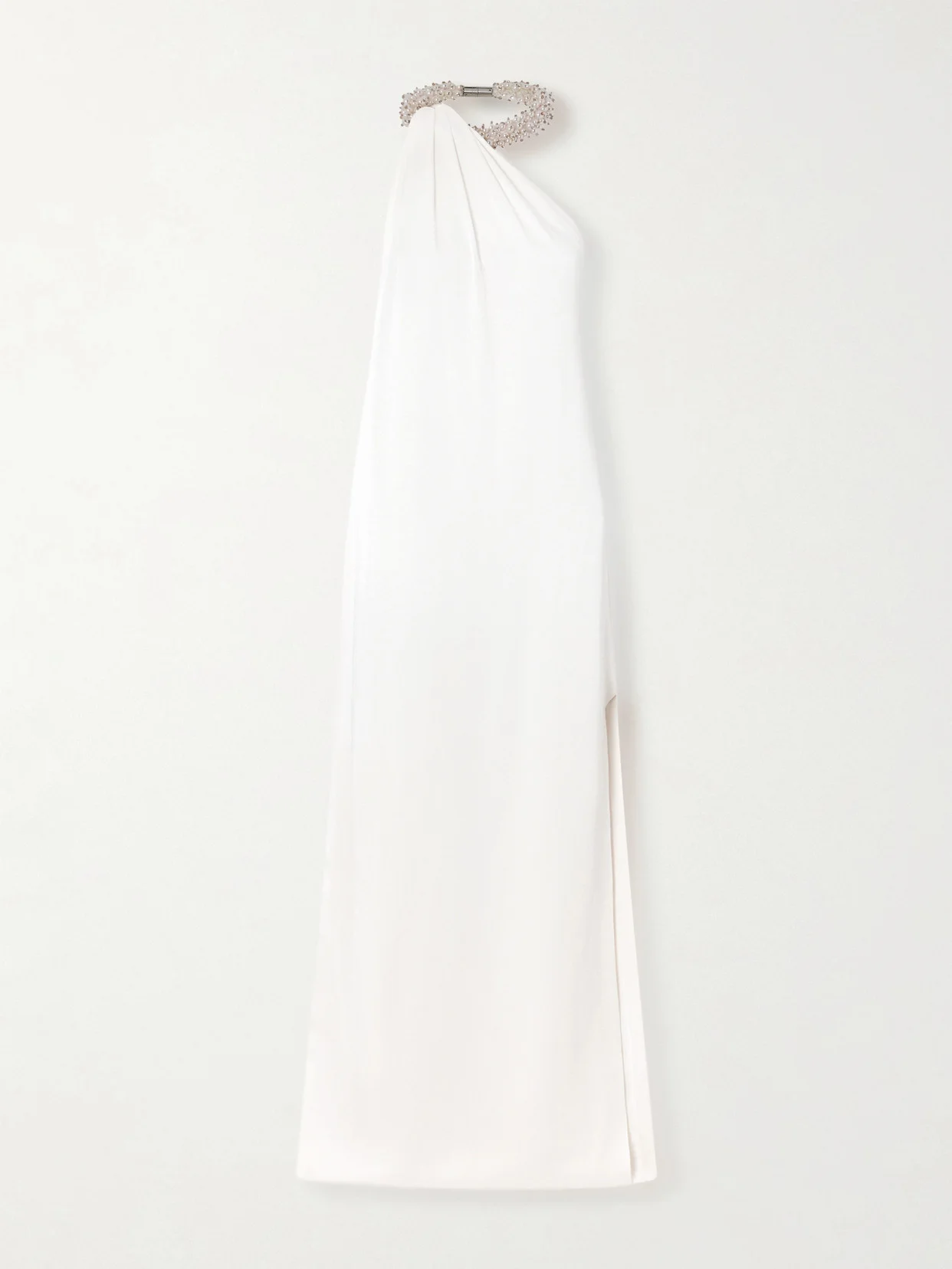 Stella McCartney's aptly named 'Forever' gown is a sophisticated choice for modern brides. It's cut from fluid satin-crepe with a rich pearlescent luster and artfully drapes from the elegant one-shoulder neckline. Coordinate your jewelry with the chunky faux pearl-encrusted collar. Lower-Impact Materials. This product is made using at least 50% lower-impact materials or ingredients. Find out more about our NET SUSTAIN criteria here.