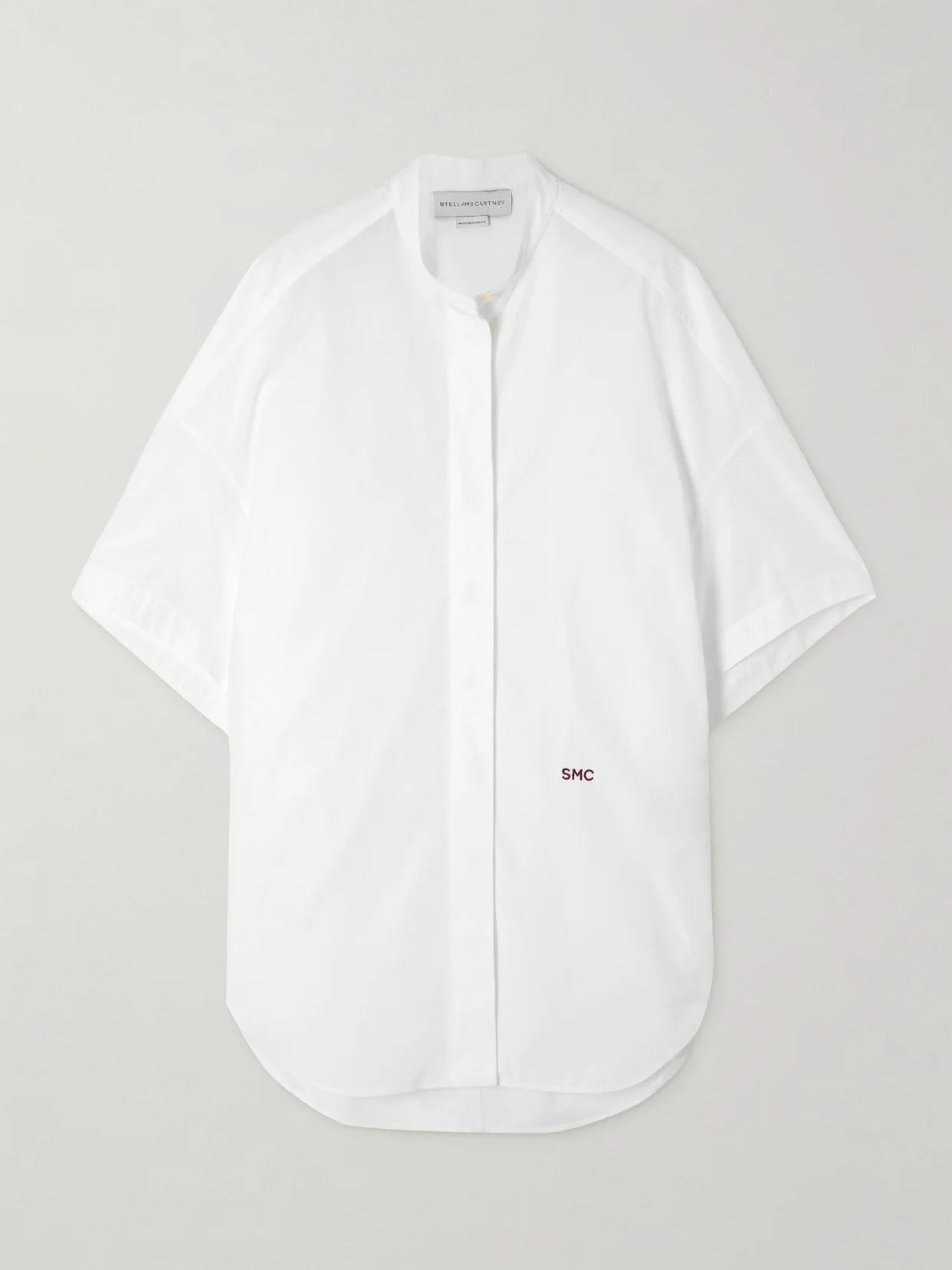 Stella McCartney's shirt is cut from cotton-poplin in a loose, oversized shape. It has a chic grandad collar and especially voluminous sleeves. The designer's initials are stitched in contrasting threads at the waist. Lower-Impact Materials. This product is made using at least 50% lower-impact materials or ingredients. Find out more about our NET SUSTAIN criteria here.