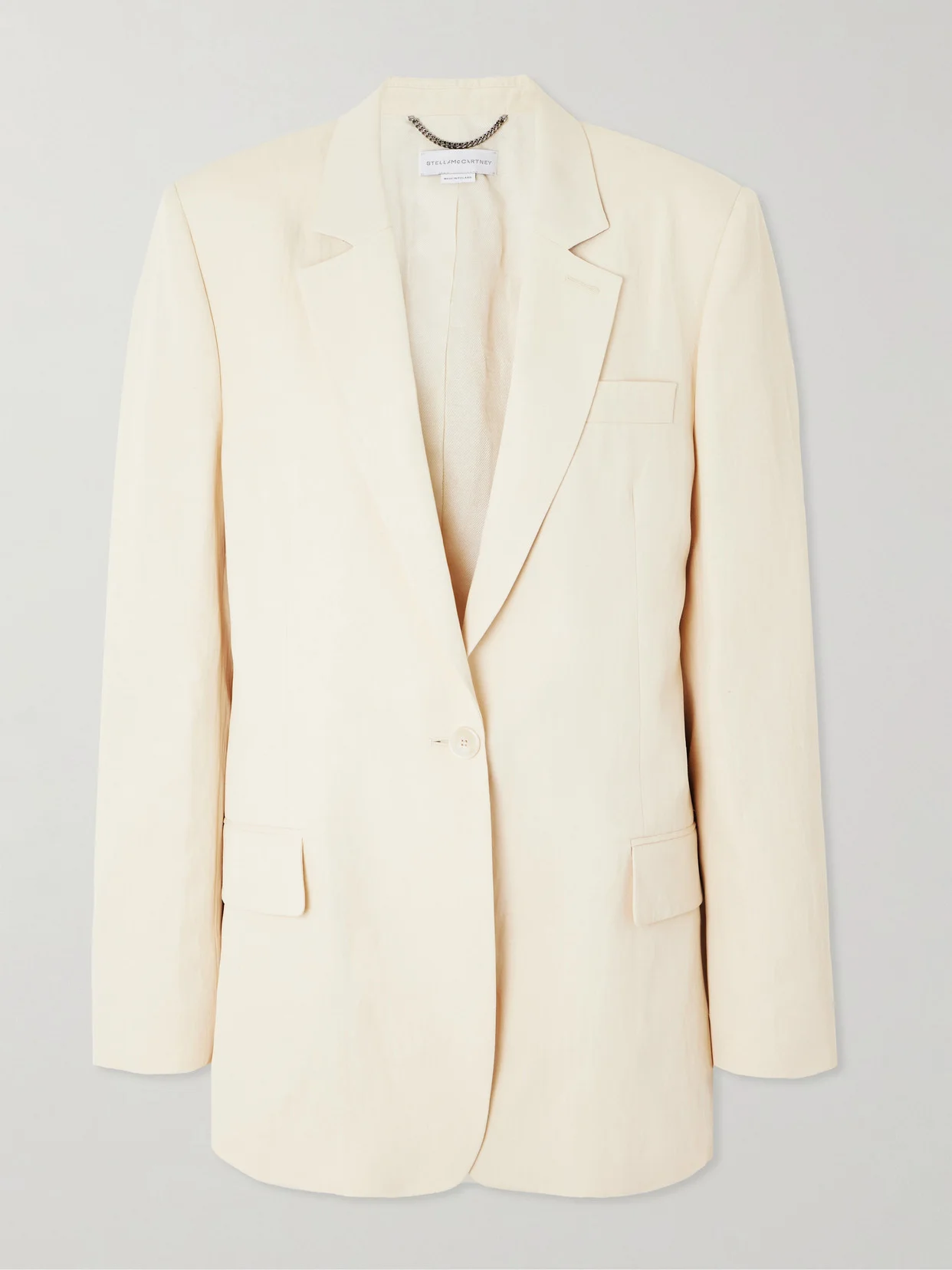 Stella McCartney's blazer is woven with a blend of certified materials and breathable linen. Refined yet relaxed, it has an oversized fit with notch lapels and padded shoulders. Layer yours over a collared shirt or statement bra top, as styled on the Spring '25 runway. Lower-Impact Materials. This product is made using at least 50% lower-impact materials or ingredients. Find out more about our NET SUSTAIN criteria here.