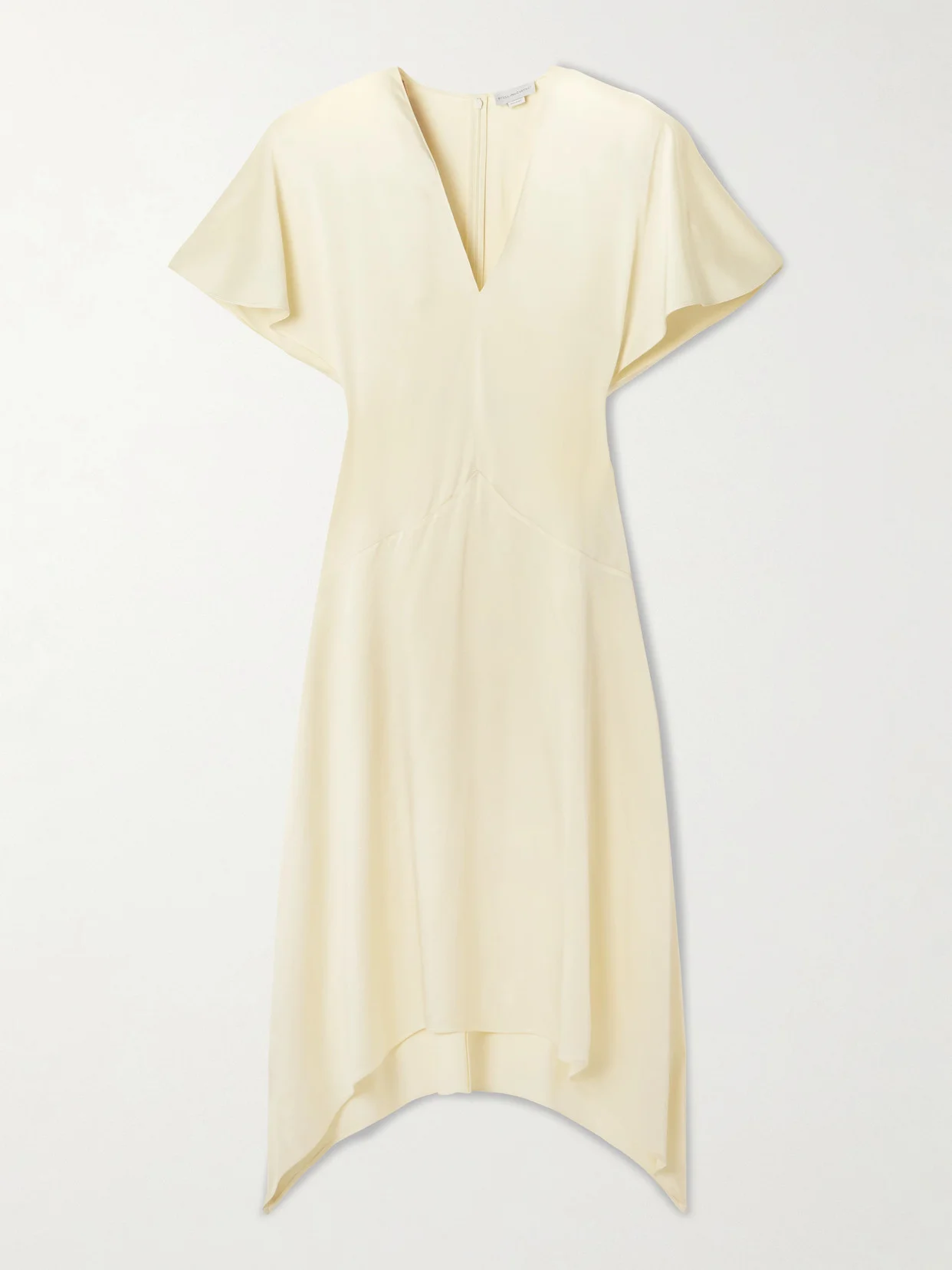 This hammered-satin dress forms part of Stella McCartney's Spring Summer 2026 collection. It has a beautifully fluid drape that contrasts with the architectural lines of the neckline and sleeves. The asymmetric hem adds gentle movement.