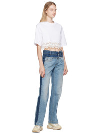 Non-stretch denim jeans. · Paneled construction · Belt loops · Five-pocket styling · Zip-fly · Raw edge detailing at front · Creased legs · Logo patch at back waistband · Contrast stitching in tan Made from cruelty-free, non-animal materials. Supplier color: Mid blue