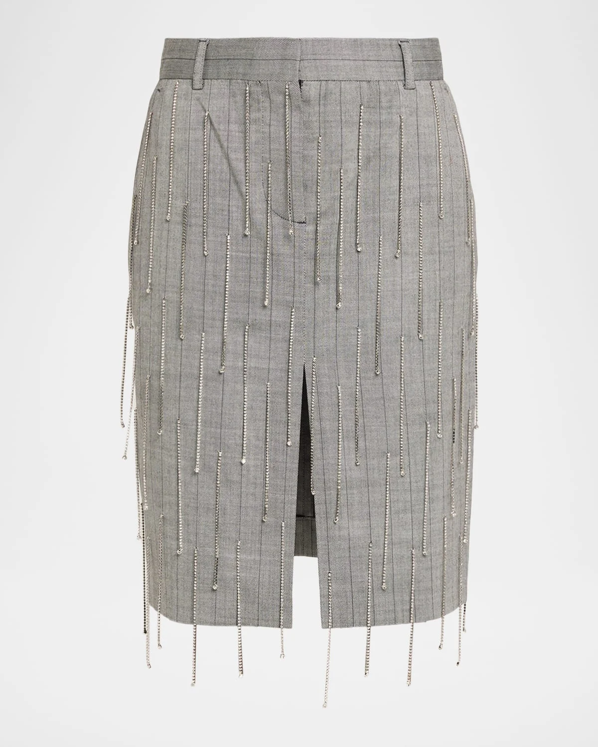 Stella McCartney skirt, tailored from pinstripe wool suiting embellished with rhinestones Flat waistband Rear welt pocket Center front slit Calflength hem Straight silhouette Concealed zip closure Wool/elastane/glass Made in Hungary