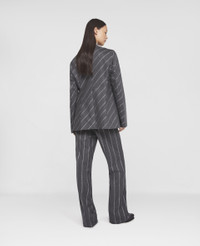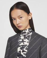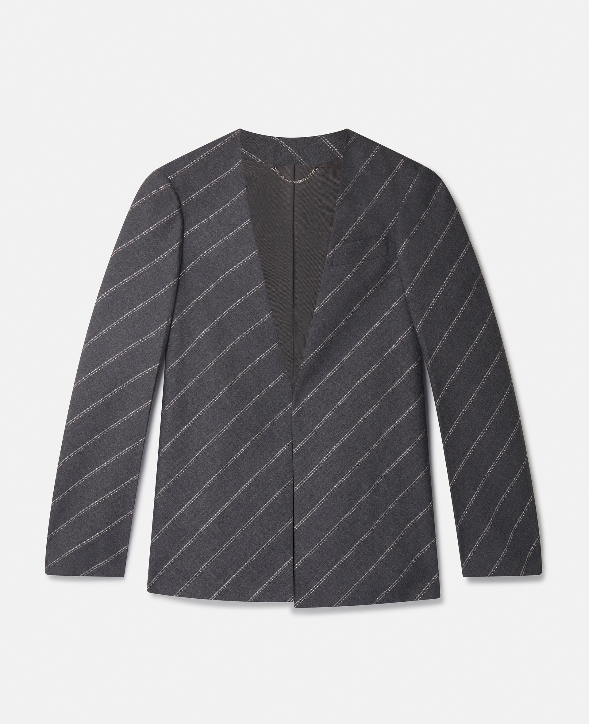 This collarless jacket is a timeless example of Stella’s iconic Savile Row tailoring roots – with a modern twist. Shimmering pinstripes, juxtaposed diagonally and vertically, pay homage to legendary American artist Frank Stella’s V Series (1968). Winter 2022 reflects Stella women who are both creators and collectors, turning pragmatic staples into effortlessly wearable art. - Colour: Grey - Grey with shimmering chalk white pinstripe - Wool blend - Collarless - Long sleeves - Button cuffs - Two front patch pockets - Open front - Forest-friendly viscose lining - Made in Poland Product Care & Fit Advice - Care: Dry clean only - Composition: Main fabric: 98% responsibly sourced wool, 2% polyester, Secondary fabric: 100% viscose, Lining: 52% viscose, 48% organic cotton - Größengetreuer Schnitt - Für eine normale Passform entworfen - Mittelschwerer, nicht dehnbarer Stoff