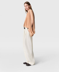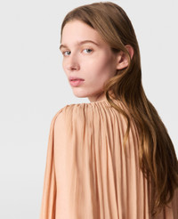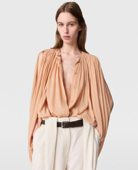 Item 6201503DU2516801 Shaped to a crewneck, cape-sleeve silhouette from organic silk chiffon, this Stella McCartney top is expertly draped to float sensually over the body. Constructed with sculptural pleats that run from top to bottom, its outline dances with every motion. Contrast its feminine form with iconic Stella McCartney baggy denim. - Color: Nude - Crewneck - Long-sleeve - Ruffled chiffon pleats - Dipped hem - Zipper fastening - Made in Italy Product Care & Fit Advice - Care: Dry clean only - Composition: 100% Silk - Fit: Regular fit - Sizing:: Take your usual size