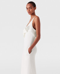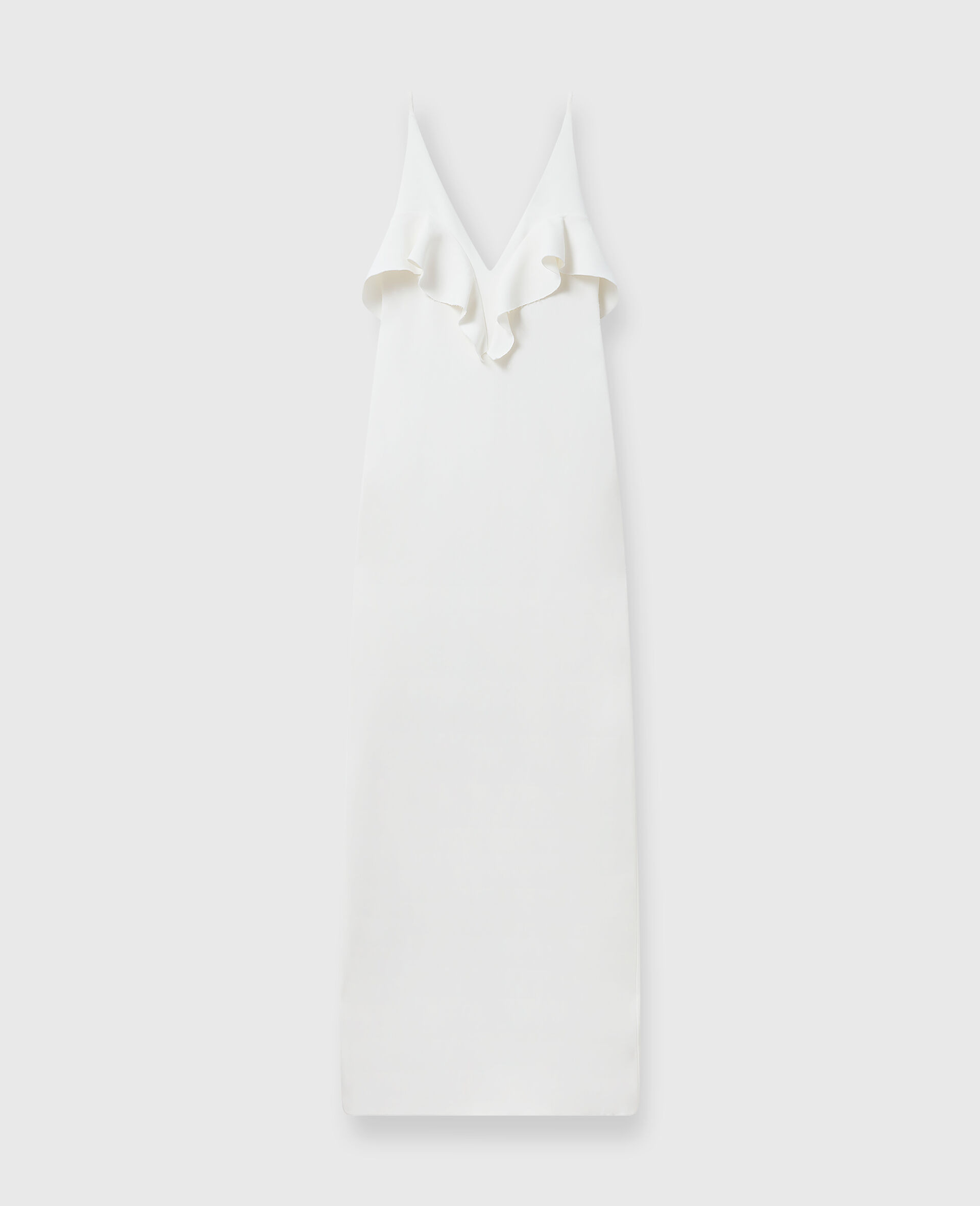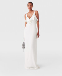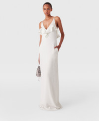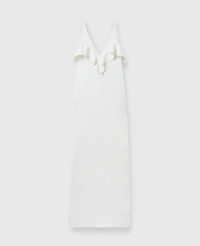 Item 6A0485SNA289001 Inspire evening glamor with this dramatic dress from Stella McCartney. Crafted using a luxurious satin innovated from responsibly sourced wood pulp, the gown is topped with a V-neck and a tiered, ruffled panel at the chest. - Color: White - Forest-friendly viscose-blend double satin - Tiered ruffled panel - V-neck - Sleeveless - Floor-length hem - Made in Italy Product Care & Fit Advice Care: Dry clean only Composition: 51% viscose, 47% acetate Fit: Regular fit Sizing: Take your usual size Lightweight, non-stretch fabric