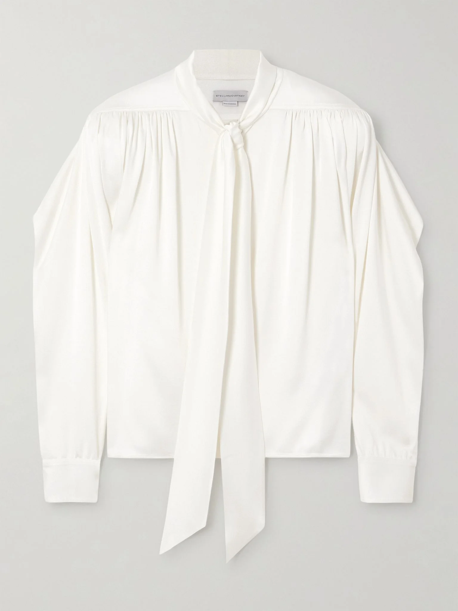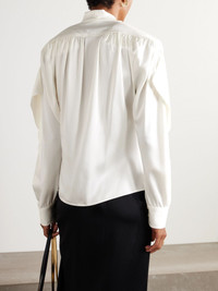 From the exaggerated padded shoulders to the pussy-bow ties, SAINT LAURENT's blouse has a distinct '80s feel. It’s made from lustrous satin that's gathered along the yoke and fastens with a neat row of mother-of-pearl buttons. Wear yours with tailoring. Size & Fit - Fits true to size, take your normal size - Designed for a relaxed fit - Detachable Internal shoulder pads - Lightweight, fluid, non-stretchy fabric - Model is 177cm/ 5'10" and is wearing an IT 40 Model measurements: - Bust: 86cm/ 34" - Waist: 65cm/ 25.5" - Hip: 90cm/ 35.5" Details & Care - White satin - Button fastenings through front - 73% acetate, 27% viscose - Dry clean - Mother-of-pearl: Australia