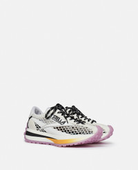 The Reclypse is a sustainable innovation in luxury trainers, crafted from vegan, recycled or plant-based materials. Taking a step towards circularity, its lining is made from ECONYL® regenerated nylon – with some styles including a recycled polyester upper and all having a tractor sole using bio-based, renewable materials. - Color: White & Black - Lace-up mesh sneakers - Exaggerated outsole with a patterned tread - Contrasting lilac sole and black laces - Stella McCartney logo on the side and back - Care: Spot clean only with soft damp cloth - Composition: Upper 31% polyamide, 33% polyurethane, 36% polyester; Lining: 78% recycled polyester, 22% elastane; Outsole: 60% eco TPU, 40% polyurethane Product Care & Fit Advice - 40 mm/1.6 in. sole - All of our shoes and accessories are made from non-leather materials as part of our cruelty-free ethos.