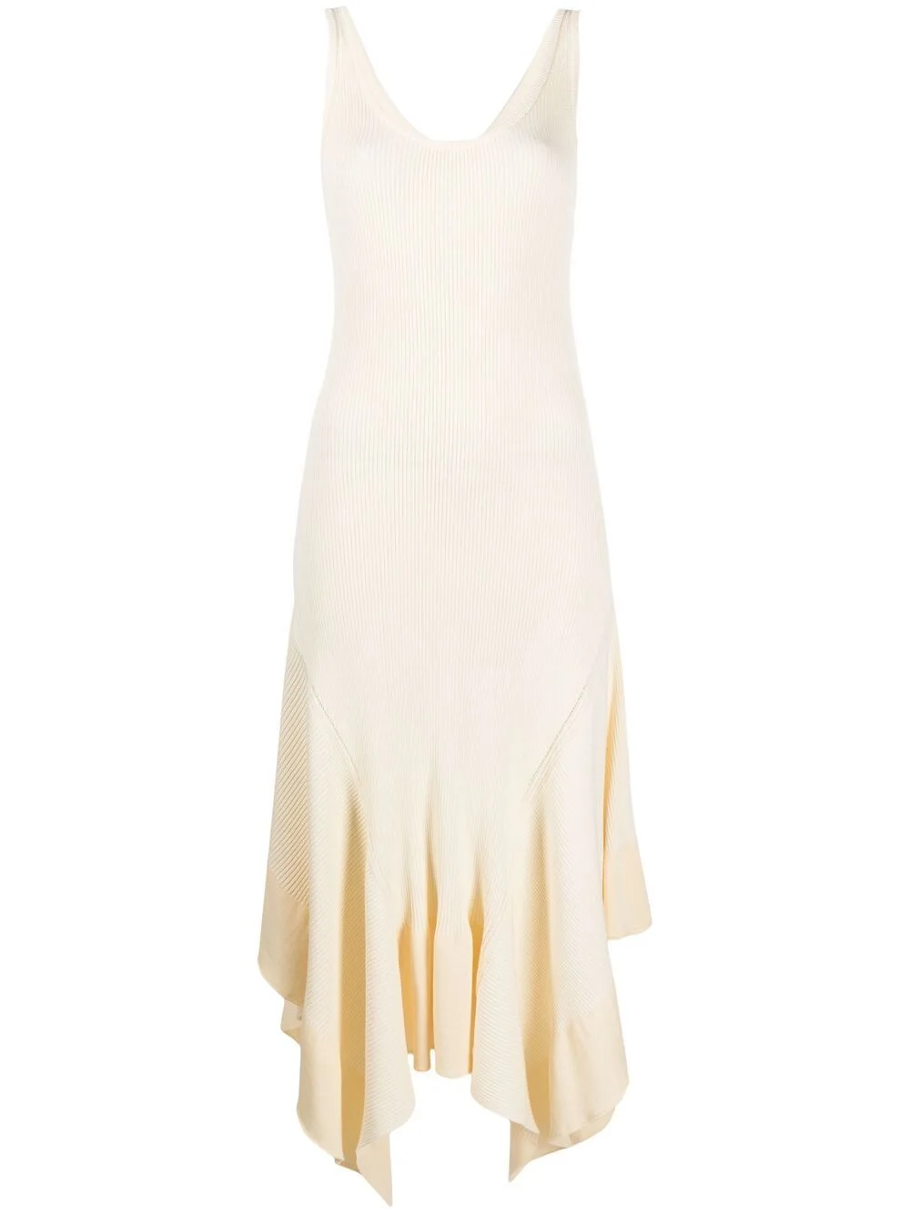 rib-detail asymmetric dress Looking for knitwear with a difference? You're in luck, this rib-detail asymmetric dress from Stella McCartney is just what you're missing. It's anything but average. Highlights - Cream - Cotton-blend - Ribbed detailing - Scoop neck - Sleeveless - Asymmetric hem Made in Italy Composition Cotton 52%, Viscose 48% SIZE & FIT Model measurements Height 5 ft 10 in(1.78 m) Bust/Chest 31.49 in(80 cm) Hips 36.22 in(92 cm) Waist 25.59 in(65 cm) FittingInformation This piece fits true to size. We recommend you get your regular size Designed for a close fit at the bust, waist and hips Made with a mid-weight fabric Washing instructions Dry Clean Only