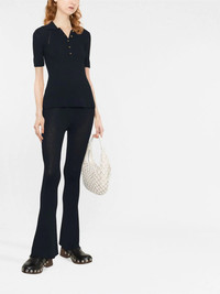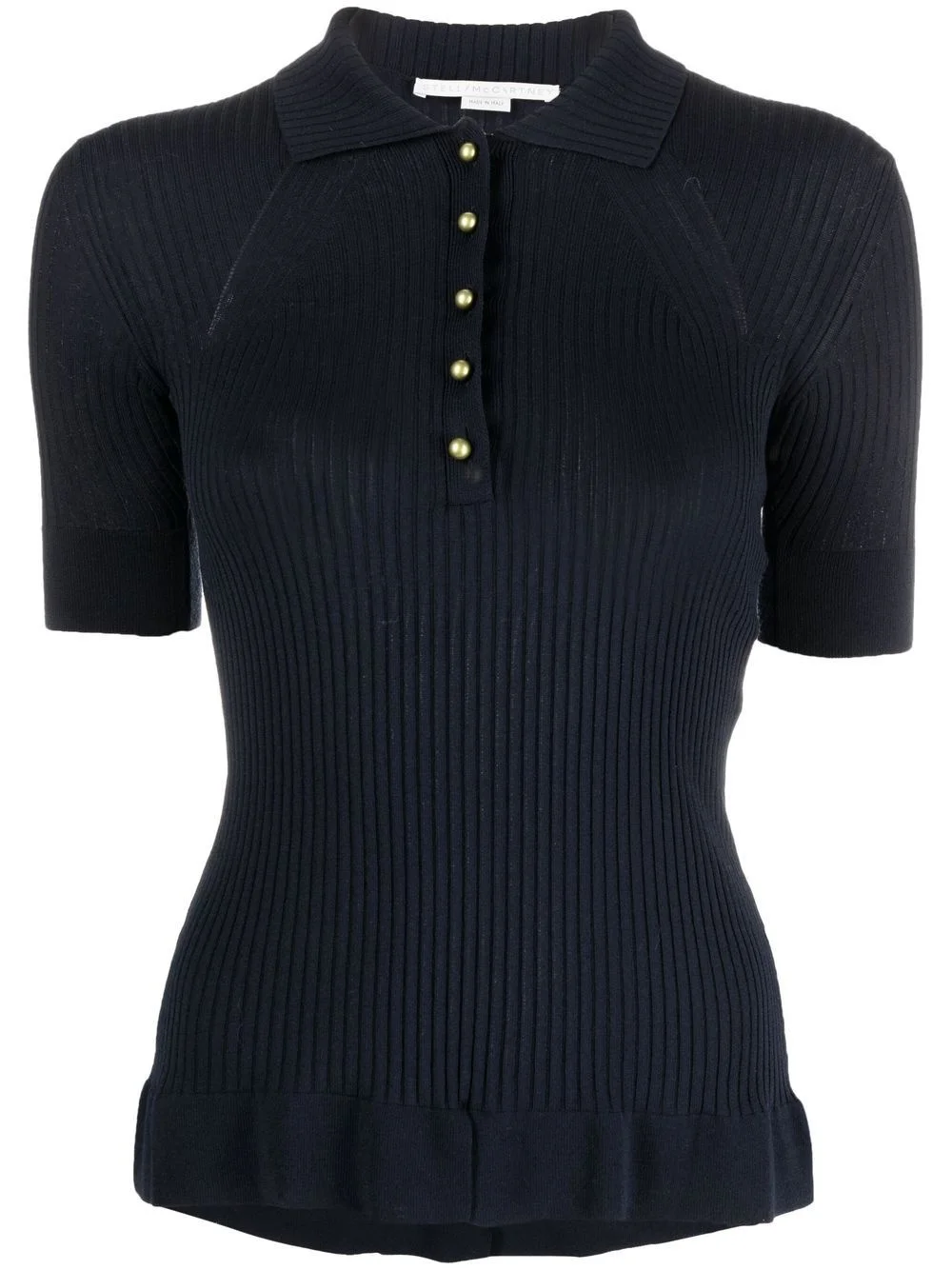 ribbed-knit polo top Stella McCartney reimagines the classic polo shirt for AW22. Here, it is realised in a ribbed midnight blue construction and detailed with a delicate ruffle hem. Highlights - Midnight blue - Ribbed knit - Polo collar - Short raglan sleeves - Front button placket - Ruffle hem Made in Italy Composition Viscose 88%, Polyester 12% SIZE & FIT Model measurements Height 5 ft 10 in(1.78 m) Bust/Chest 31.49 in(80 cm) Hips 35.43 in(90 cm) Waist 24.4 in(62 cm) FittingInformation This piece fits true to size. We recommend you get your regular size Cut for a slim fit Made with a mid-weight fabric Washing instructions Dry Clean Only