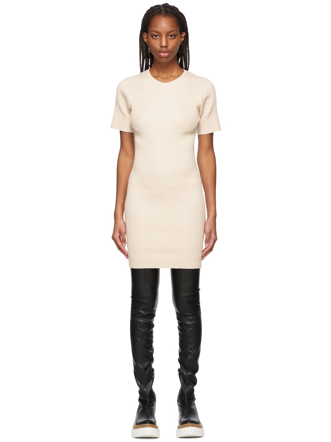 Short sleeve stretch rib knit cotton-blend short dress in beige. Crewneck collar. Bustier-style detailing at chest. Made from cruelty-free, non-animal materials. Supplier color: Oat 80% cotton, 17% polyamide, 3% elastane.
