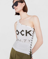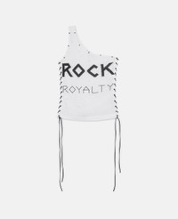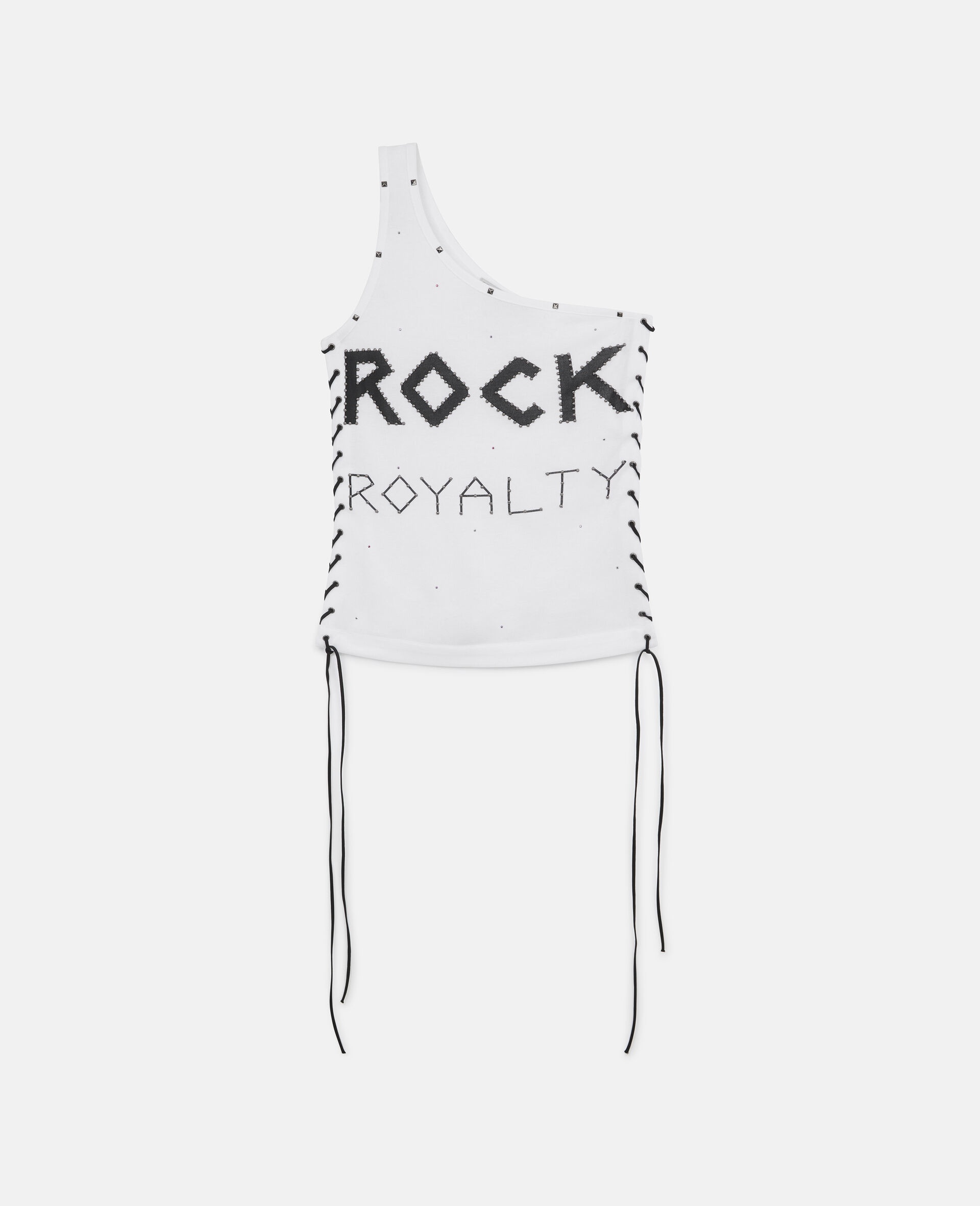 Item 604196SPW249000 Revisiting an iconic moment from Stella’s past in innovative materials that protect our shared future, our Rock Royalty tops are made of Refibra™ jersey – crafted from recycled garment fibers, advancing our commitment to reducing waste and increasing circularity. - Color: Pure White - T-Shirt - One shoulder sleeveless design - Lacing details up both sides - Stud detailing at the collar - Iconic "Rock Royalty" print at the front Product Care & Fit Advice - Care: Dry Clean - Composition: 67% REFIBRA™, 33% Organic Cotto - Fits true to size - Designed for a tight fit - Light-weight, stretchy fabric - Model is 5ft 10in/1.78m, is a size UK 8 and wears a size IT 40 (US 4/UK 8/FR 36)