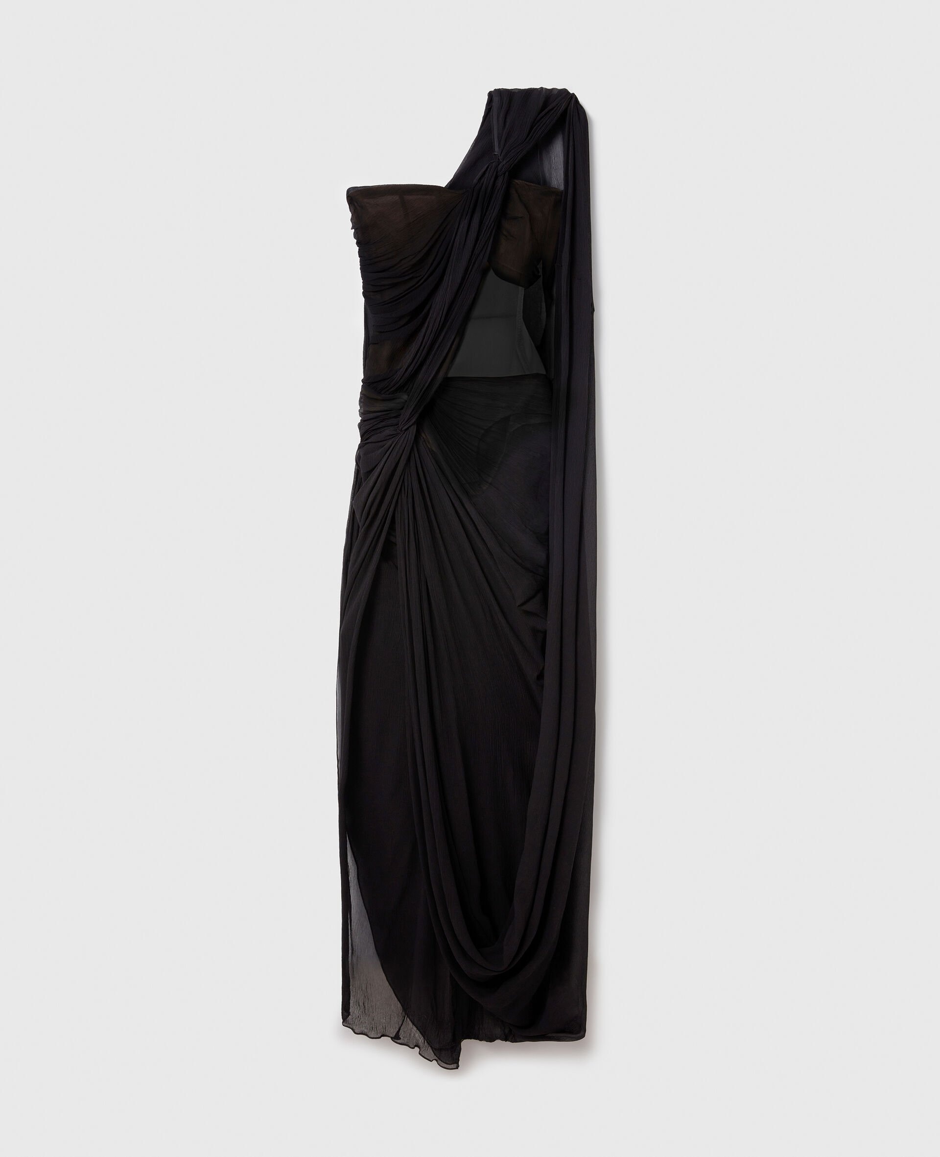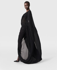 Item 6A05283DU2511000 Spun from featherlight organic silk, this asymmetric dress from the Summer 2025 runway is both directional and sensual. It is dramatically shaped to a floor-length silhouette with a single cape sleeve, contrasted with sheer, ruched panels wrapped and knotted around the torso. - Color: Black - Asymmetric - Sheer and semi-sheer paneling - One long sleeve - Draped thigh-length hem - Ruched all-over - Knotted at shoulder and hip - Floor-length hem - Zipper fastening - Made in Italy Product Care & Fit Advice - Care: Dry clean only - Composition: 100% Silk - Fit: Regular fit - Sizing: Take your usual size - Model is 180cm or 5' 11"