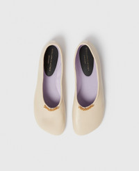 Item 810515W1G909320 The Ryder ballet flat is revisited for Spring 2025. Sculpted from our soft, buttery vegan leather alternative, they are shaped to a feminine ballerina outline that’s handstitched with a glimmering chain detail. Each is also lined with comfort-enhancing padding. - Color: Vanilla - Vegan alternative to animal leather - Gold chain embellishment - Fully lined with post-consumer recycled PET - Lining is comfort-enhanced with padding and moisture-wicking technology - Slips on - Handcrafted in Italy - All of our shoes and accessories are made from non-leather materials in keeping with our cruelty-free ethos. Product Care & Fit Advice - Care: Spot clean only with soft damp cloth. - Composition: 70% polyurethane, 20% polyester, 10% cotton - Fit: True to size - Heel height: 0.5mm