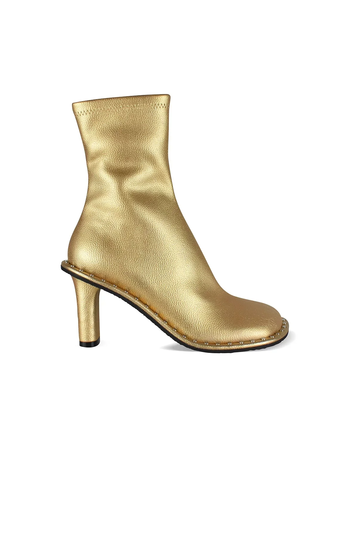Ryder Stella McCartney golden sock boots. Made of vegan leather. Silver stud detailing around the sole. Zipper on inner sides. Angular, rounded closed toe. Thick 8.5 cm heel. Made in Italy.