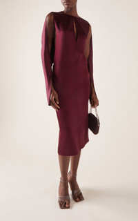This season is a celebration of the Stella McCartney DNA. What is familiar becomes fresh again, as classic brand icons are made contemporary with wearability, desirability and, of course, sustainability. The gown is satin in burgundy hue that features a keyhole cutout by the front and a slit long sleeves, a column midi silhouette and a slit by the back. PRODUCT DETAILS - Pre-Fall '25 - Zip Fastening Through Back - Composition: 73% Acetate; 27% Viscose - Designer color: Burgundy - Dry clean only - Imported