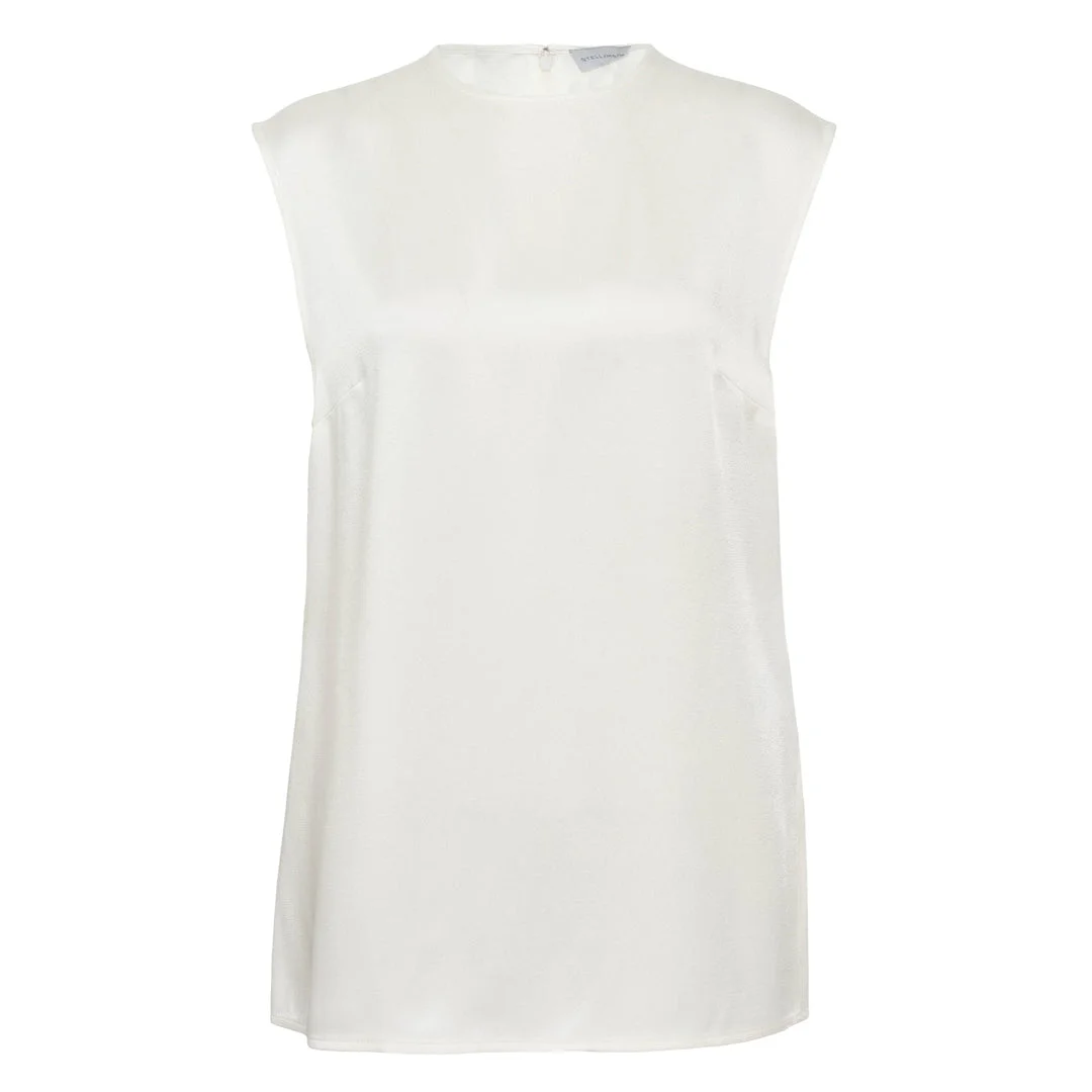 600076730OWT034 / PS26-6T0017/3FU302/9200 - Premium satin construction - Sleeveless design - Round neckline - Relaxed fit silhouette - Lustrous finish - Button closure at back neck Stella McCartney Satin Sleeveless Top delivers effortless sophistication with luxurious drape and versatile styling. Crafted from premium satin with a lustrous finish in pristine off-white, featuring a relaxed silhouette and clean neckline. The fluid construction and signature minimalist aesthetic create an elegant foundation piece for contemporary dressing.