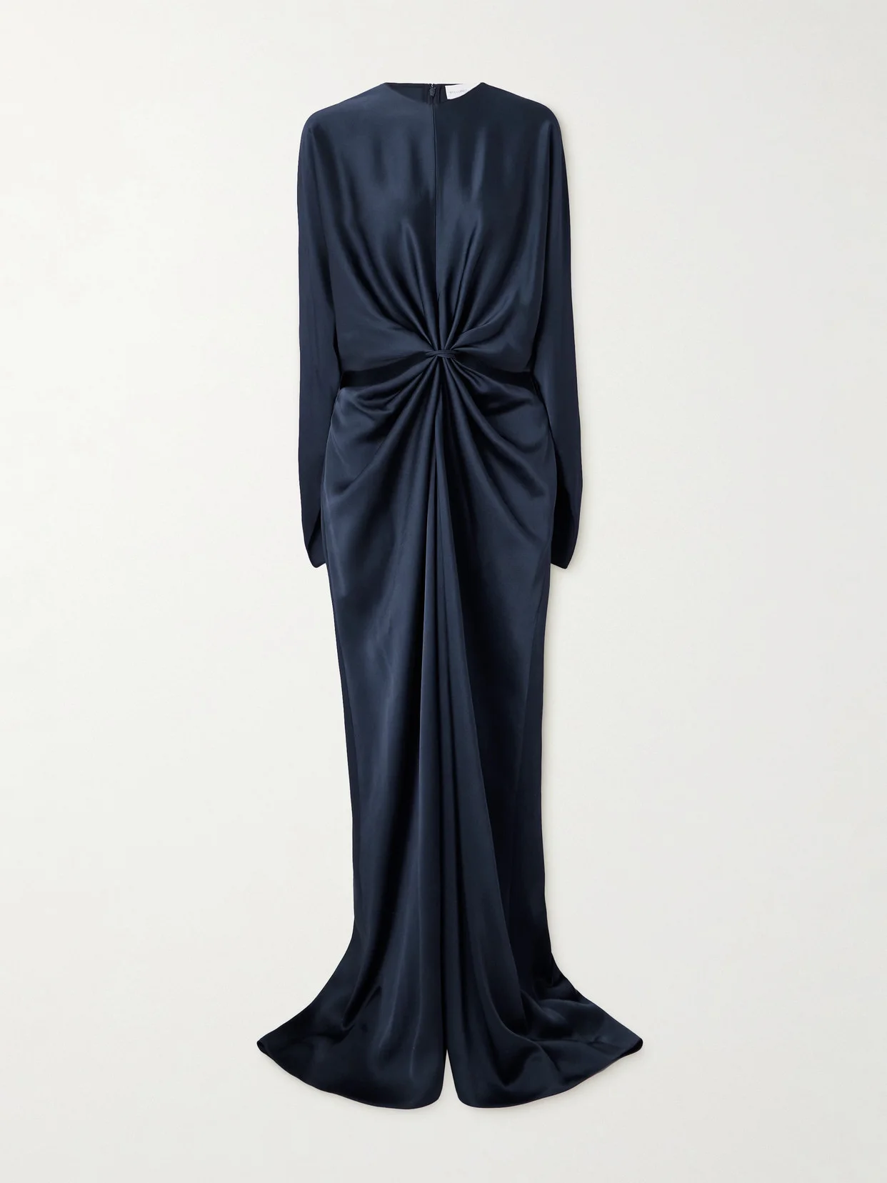Stella McCartney's Fall '25 collection is defined as a "collection of greatest hits;" referencing '70s rockstars and the glamour of her parents. Cut from glossy satin, this gown is framed with lightly padded shoulders and has a twist-front, cutout bodice that shows flashes of skin.