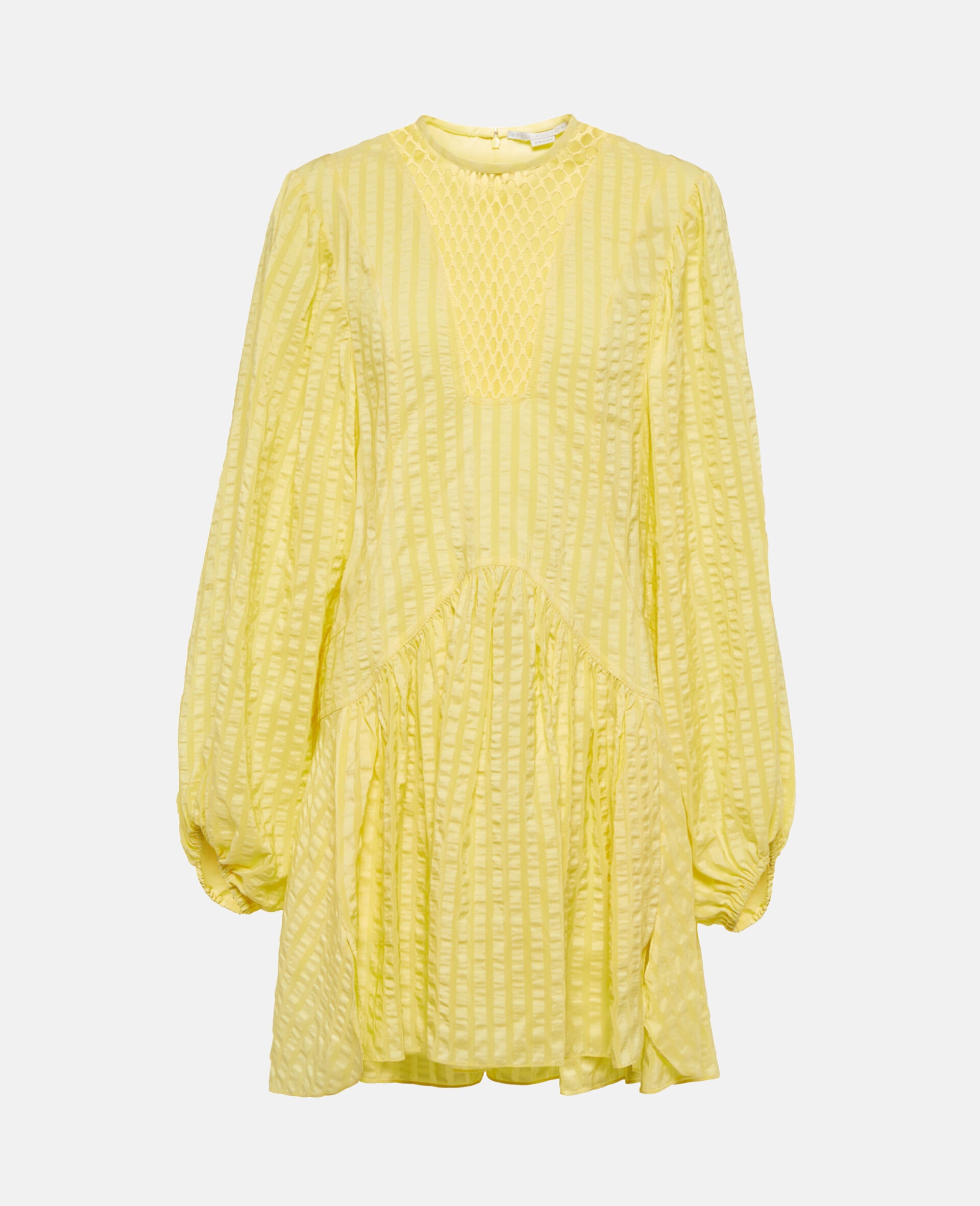 Summer 2022 evokes a sensual femininity, encouraging Stella women to redefine sexiness with an effortless and vibrant wardrobe. It harmonizes billowing shapes with bodycon silhouettes, near-transparent airiness with rich textures, and biophilic cut-outs on psychedelic prints. - Color: Banana Yellow - Mini dress - Crew neck, elasticated cuffs - Long balloon sleeves - Mesh details at the chest - Concealed zip fastening at the back - All-over seersucker fabric - Made in: Italy Product Care & Fit Advice - Care: Dry Clean - Composition: 100% Silk; Secondary Materials 100% Cotton; Lining 65% Viscose, 35% Sil - Fits true to size - Designed for a relaxed fit - Lightweight, non-stretchy fabric - Model is 5 ft 9.5 in/1.77 m, is a size UK 8 and wears a size IT 40 (US 4/UK 8/FR 36)