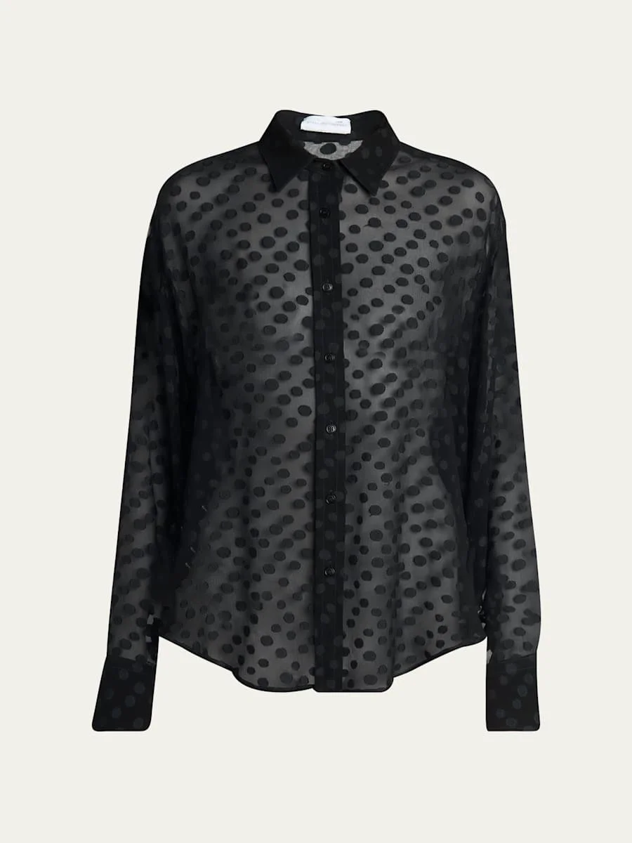 Stella McCartney sheer blouse with an allover polka dot pattern Spread collar; button front Long sleeves; button cuffs Relaxed fit Silk/polyester Dry clean Made in Romania Online Inquiries: BGS21_BA365| Store Inquiries: #5022974