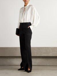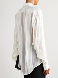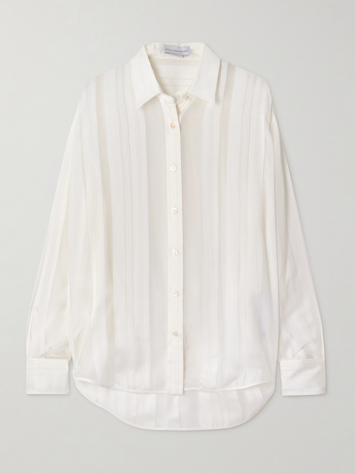Stella McCartney's organic silk shirt is designed with sheer chiffon and opaque satin panels that create a striped pattern. It's designed for a slightly loose fit with a longer back hem and has buttoned cuffs and a smart collar. Underpin yours with a camisole or triangle bra. Lower-Impact Materials. This product is made using at least 50% lower-impact materials or ingredients. Find out more about our NET SUSTAIN criteria here.