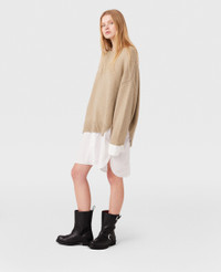 Item 6K08363S25152505 Illustrating a fusion story of Fall 2024, this sweater/shirt hybrid begins with a classic round neck, long-sleeved outline spun from RWS-certified wool. As the silhouette continues, an organic cotton hem and some buttoned cuffs peek out from beneath. - Color: Beige - Sandy beige - Round neck - Long sleeves - Organic cotton shirting details - Buttoned cuffs - Ribbed hem - Slips on - Made in Romania Product Care & Fit Advice - Care: Dry clean only - Composition: Main fabric: 100% wool, 100% organic cotton - Size: Fits true to size - Designed for a regular fit - Lightweight, mid-stretch fabric
