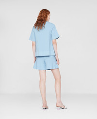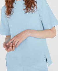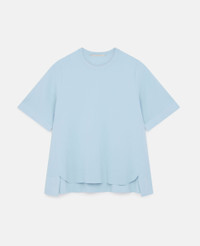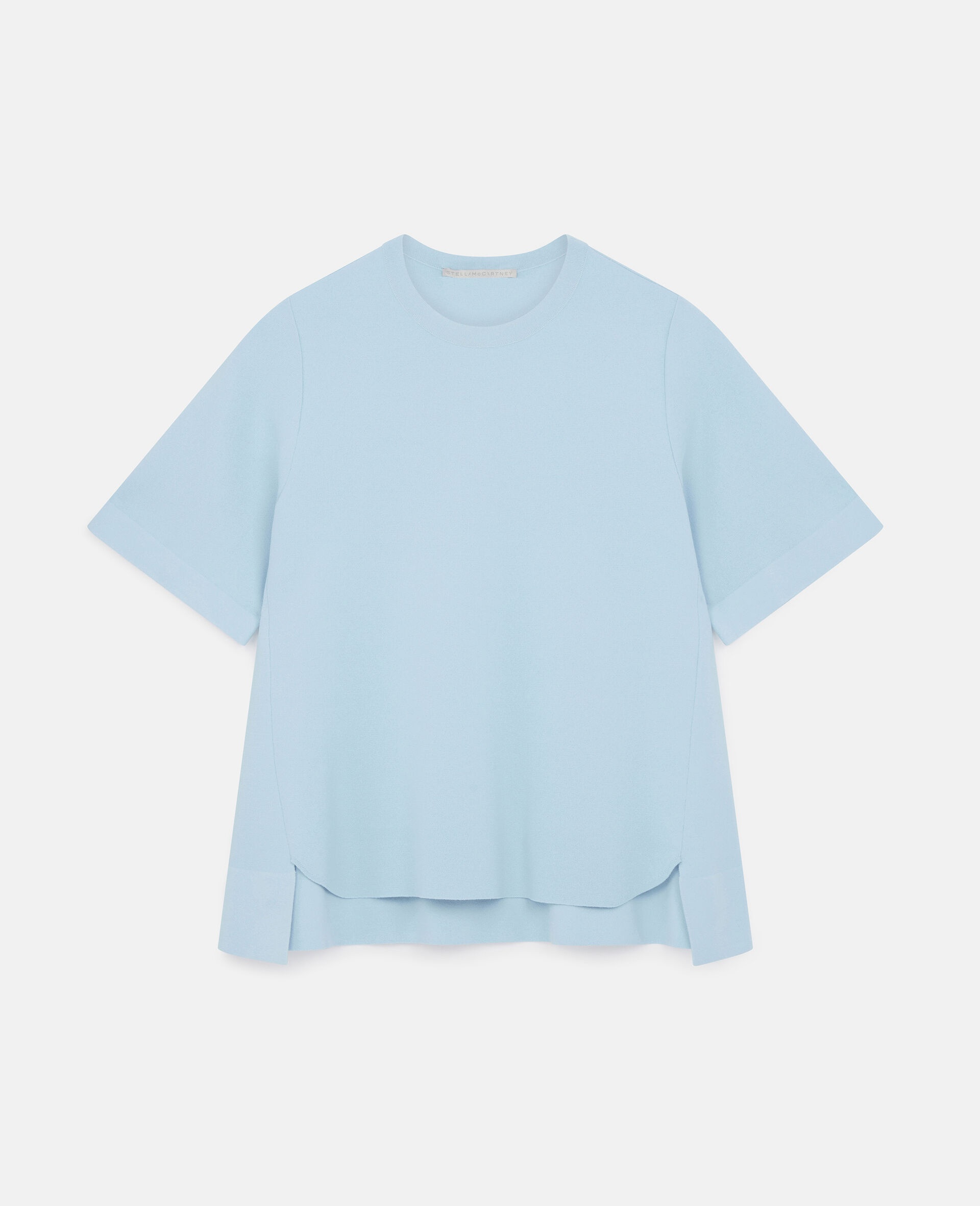 Spring 2022 is a time for renewal and a return to (night)life, made for Stella women who live in the moment and are conscious of tomorrow. The collection blends the nostalgic with the futuristic, connecting the experimental aesthetics of Y2K music subcultures and club kids to the digital youth of today. - Color: Light Blue - Knit sweater - Crew-neck, short sleeves - Compact knit - Dropped back hem - Made in: Italy Product Care & Fit Advice - Care: Dry Clean - Composition: 83% Sustainable Viscose, 17% Polyeste - Fits true to size - Designed for a regular fit - Mid-weight, Slightly stretchy fabric - Model is 5ft 10in/ 1.78m, is a size US 4 and wears a size IT 40 (UK 8/FR 36)
